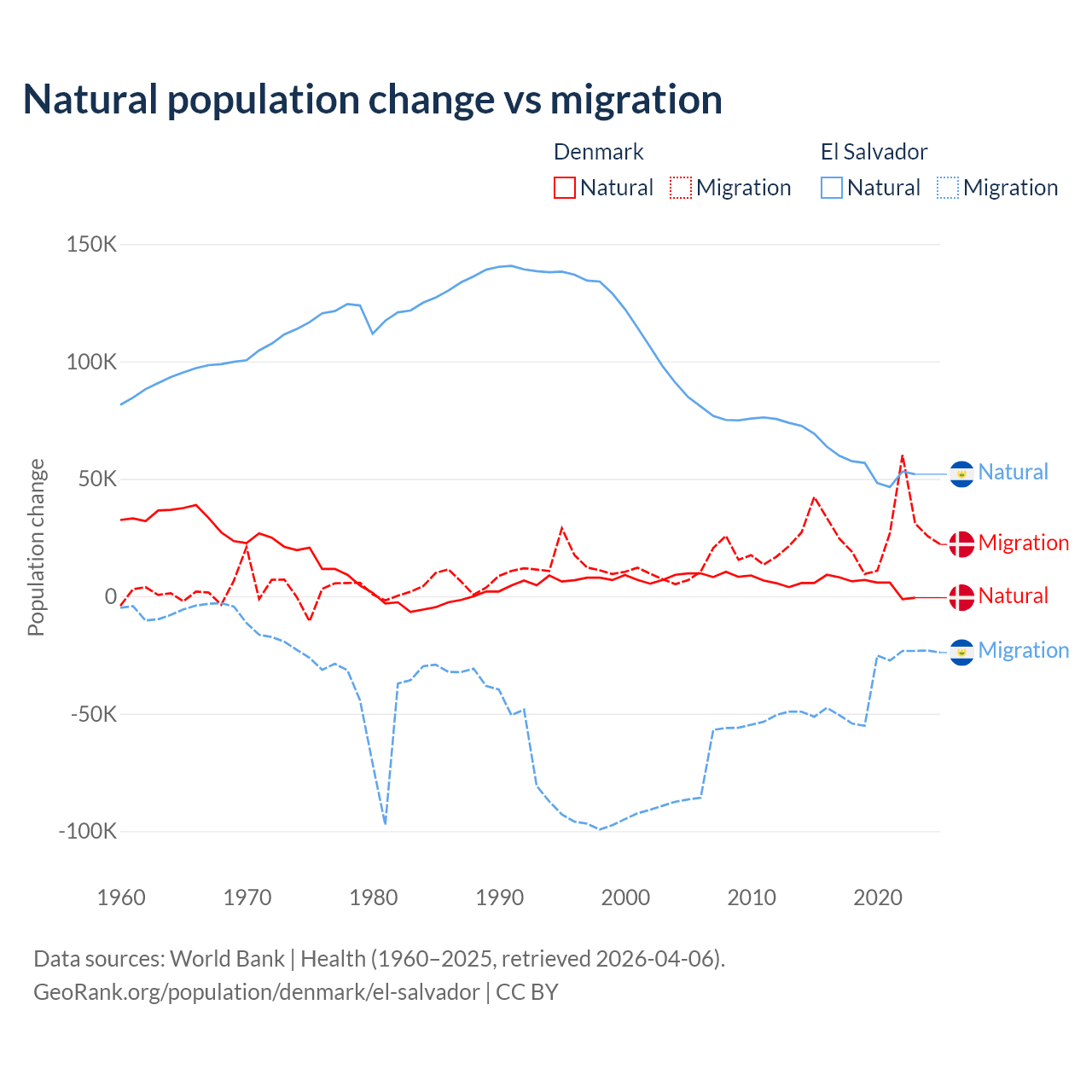 Over the last 10 years, 15.4% of the population change in Denmark is from natural causes (a gain of 51,826 people) and 84.6% is from migration (a gain of 284,848 people). In El Salvador 58.8% is from natural causes (a gain of 579,641 people) and 41.2% is from migration (a loss of 406,874 people).