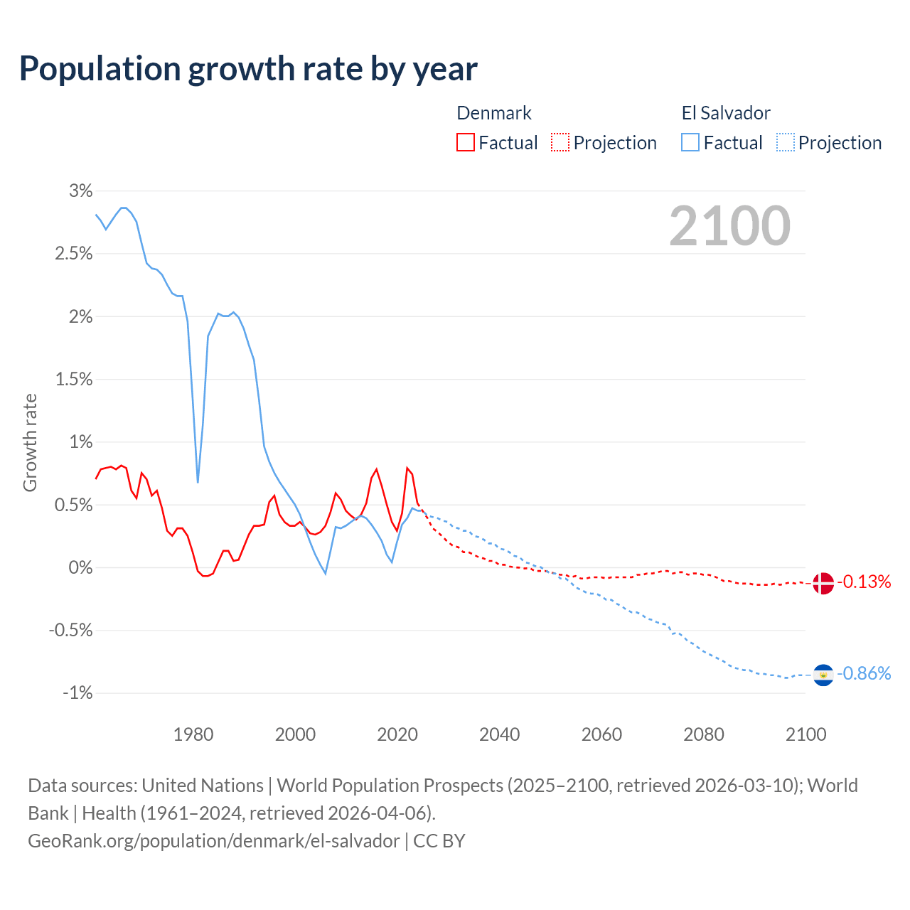- For the last 10 years, Denmark has had an average growth rate of +0.57% per year vs +0.29% in El Salvador.