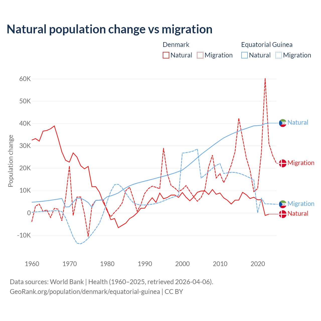 Over the last 10 years, 15.4% of the population change in Denmark is from natural causes (a gain of 51,826 people) and 84.6% is from migration (a gain of 284,848 people). In Equatorial Guinea 77% is from natural causes (a gain of 382,745 people) and 23% is from migration (a gain of 114,024 people).
