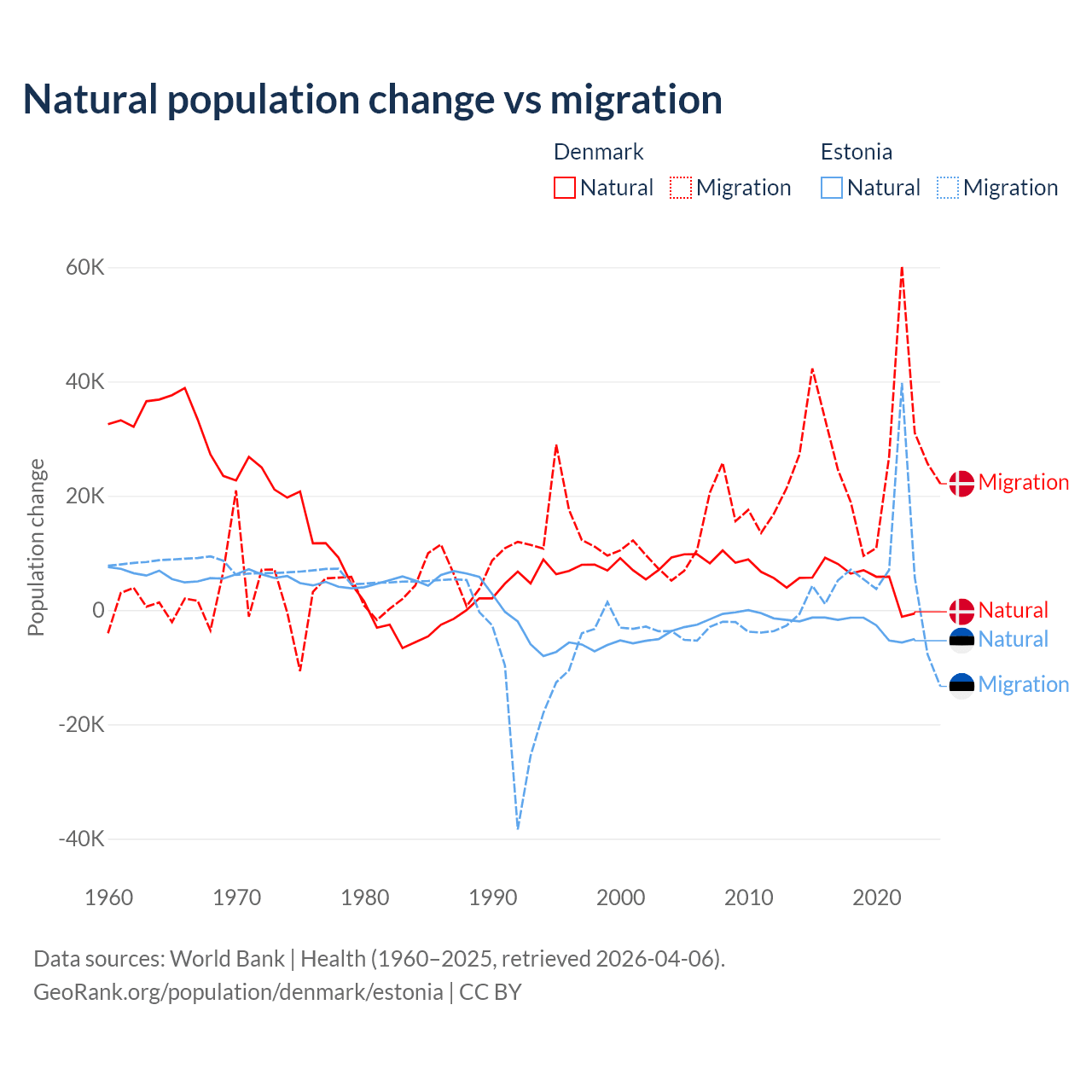 Over the last 10 years, 15.4% of the population change in Denmark is from natural causes (a gain of 51,826 people) and 84.6% is from migration (a gain of 284,848 people). In Estonia 26.1% is from natural causes (a loss of 27,683 people) and 73.9% is from migration (a gain of 78,553 people).