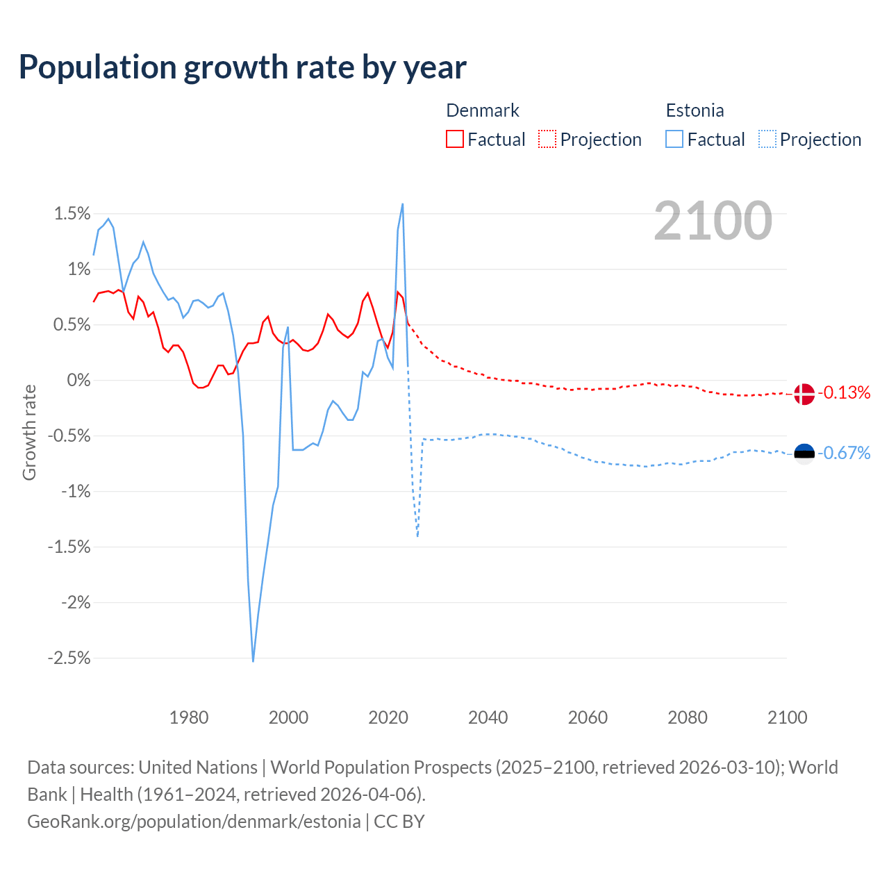 - For the last 10 years, Denmark has had an average growth rate of +0.57% per year vs +0.37% in Estonia.
