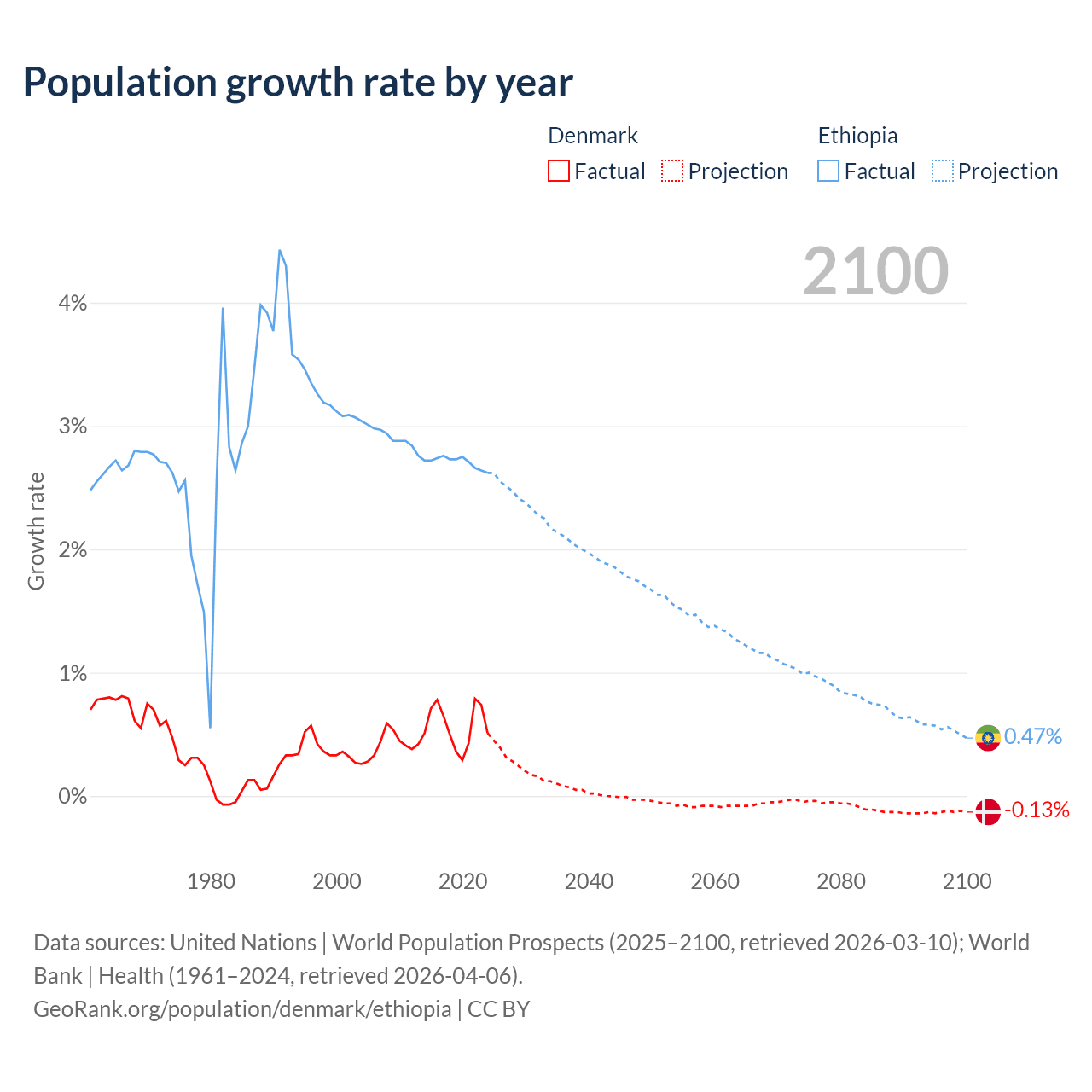 - For the last 10 years, Denmark has had an average growth rate of +0.57% per year vs +2.71% in Ethiopia.