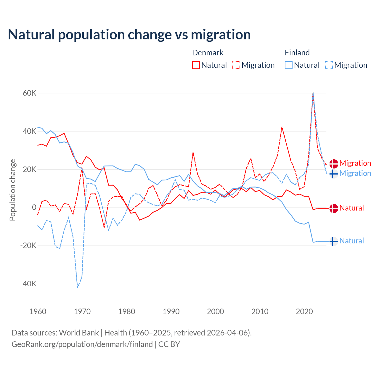 Over the last 10 years, 15.4% of the population change in Denmark is from natural causes (a gain of 51,826 people) and 84.6% is from migration (a gain of 284,848 people). In Finland 22.5% is from natural causes (a loss of 65,560 people) and 77.5% is from migration (a gain of 225,237 people).