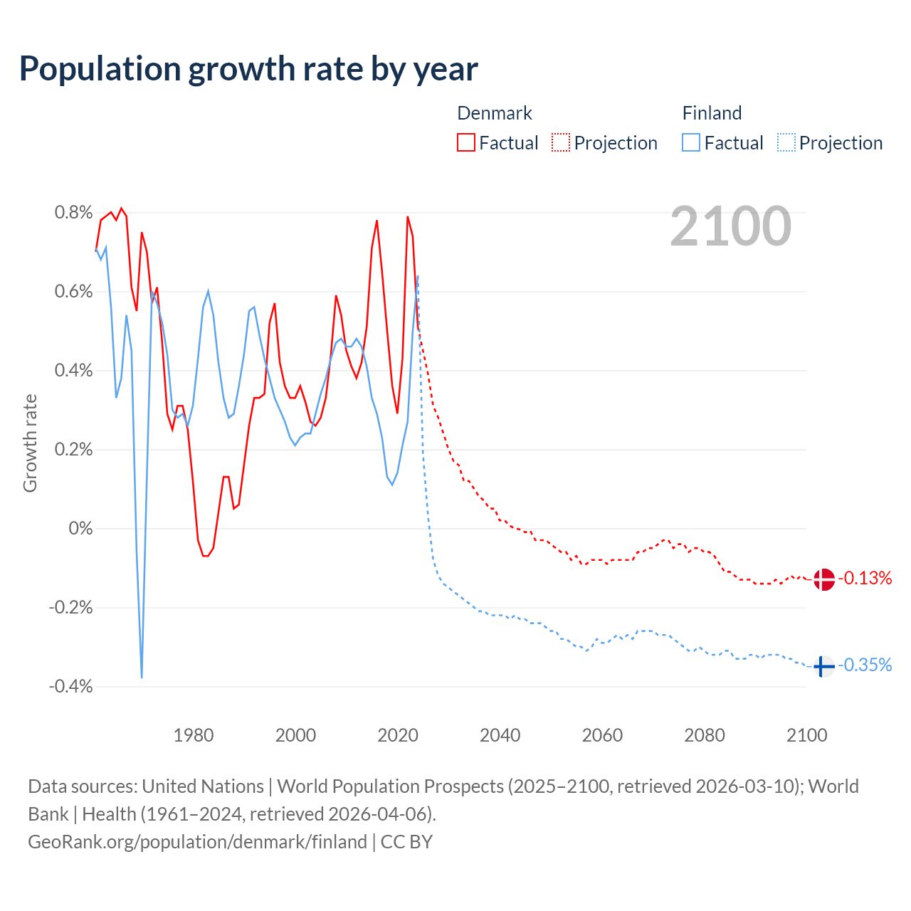 - For the last 10 years, Denmark has had an average growth rate of +0.57% per year vs +0.3% in Finland.