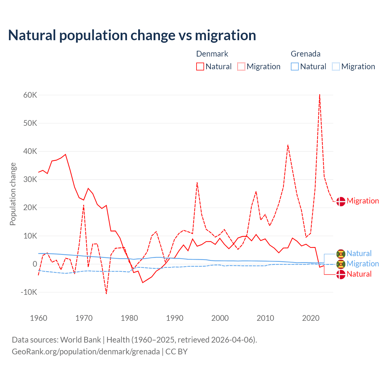 Over the last 10 years, 15.4% of the population change in Denmark is from natural causes (a gain of 51,826 people) and 84.6% is from migration (a gain of 284,848 people). In Grenada 76% is from natural causes (a gain of 4,850 people) and 24% is from migration (a loss of 1,535 people).