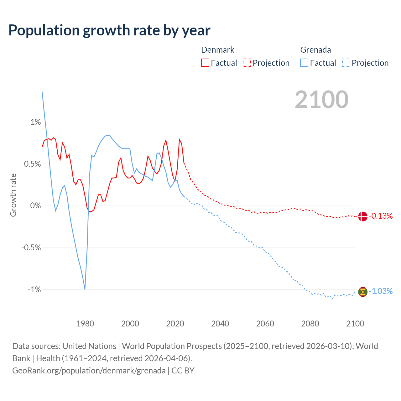 - For the last 10 years, Denmark has had an average growth rate of +0.57% per year vs +0.29% in Grenada.