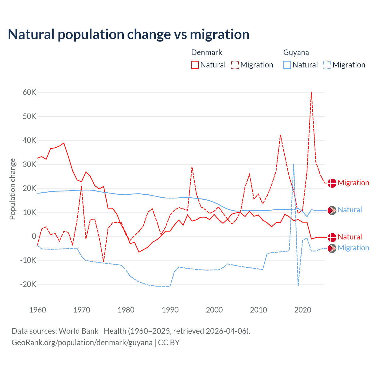 Over the last 10 years, 15.4% of the population change in Denmark is from natural causes (a gain of 51,826 people) and 84.6% is from migration (a gain of 284,848 people). In Guyana 77.7% is from natural causes (a gain of 107,419 people) and 22.3% is from migration (a loss of 30,797 people).