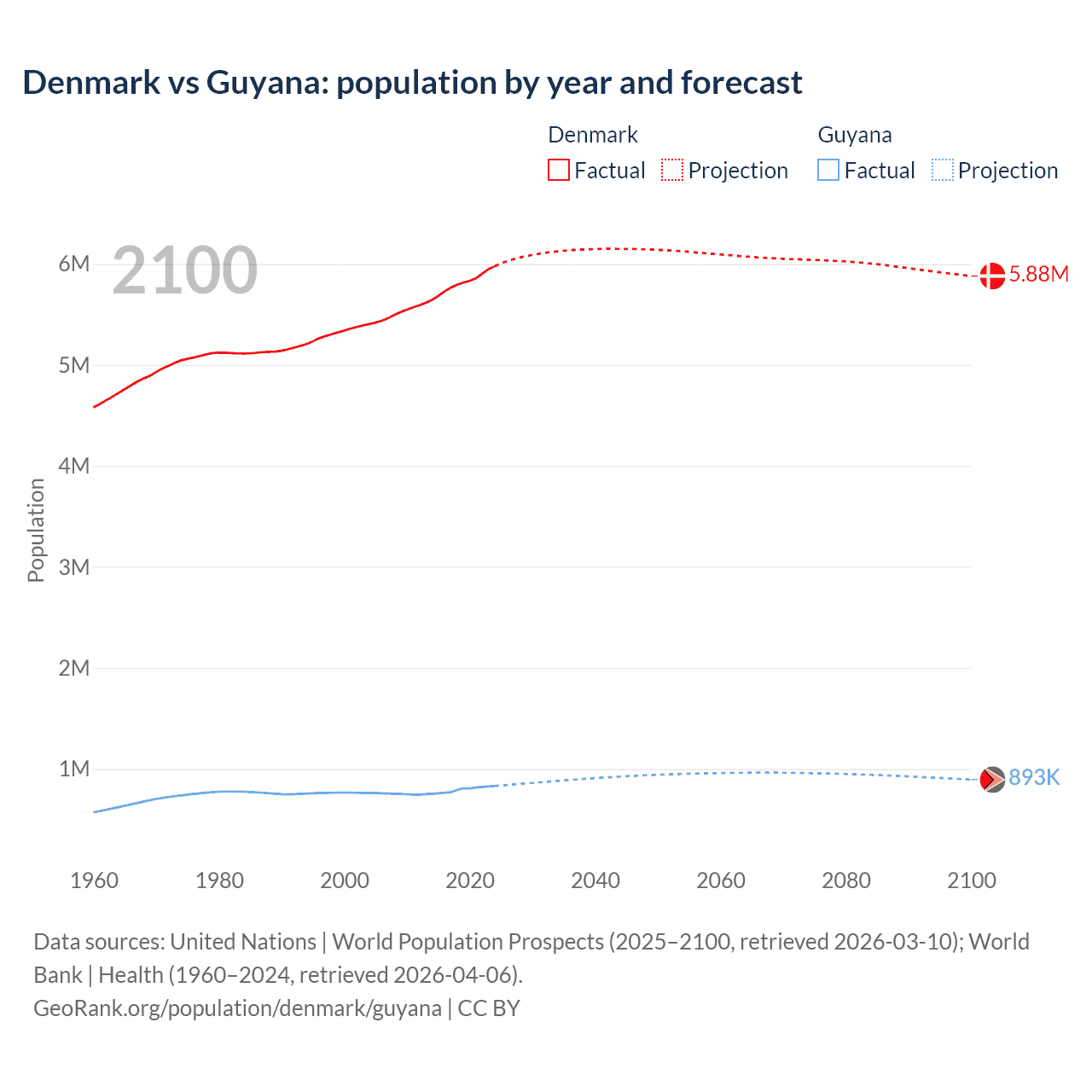 Denmark vs Guyana: population by year and forecast