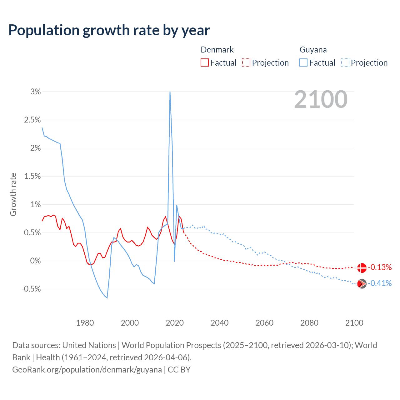 - For the last 10 years, Denmark has had an average growth rate of +0.57% per year vs +0.94% in Guyana.