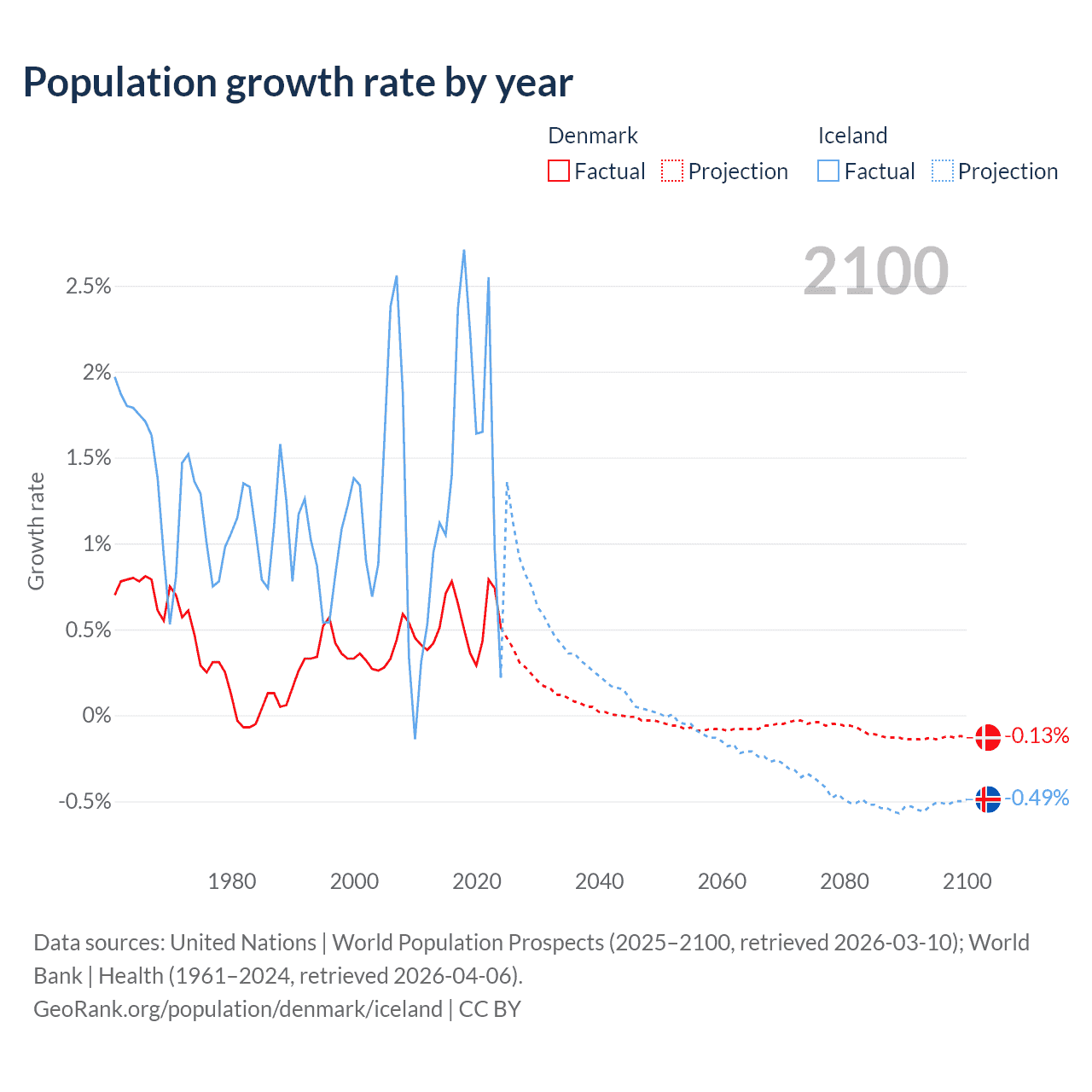 - For the last 10 years, Denmark has had an average growth rate of +0.57% per year vs +1.63% in Iceland.