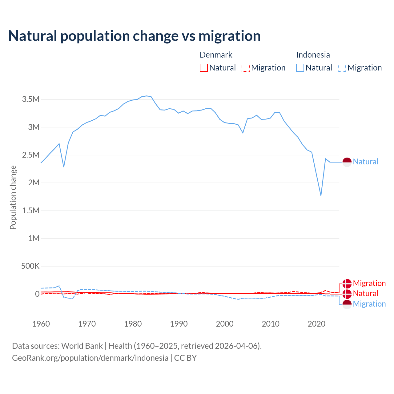 Over the last 10 years, 15.4% of the population change in Denmark is from natural causes (a gain of 51,826 people) and 84.6% is from migration (a gain of 284,848 people). In Indonesia 98.9% is from natural causes (a gain of 25,242,860 people) and 1.1% is from migration (a loss of 280,258 people).