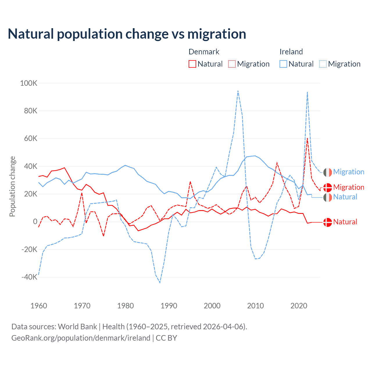 Over the last 10 years, 15.4% of the population change in Denmark is from natural causes (a gain of 51,826 people) and 84.6% is from migration (a gain of 284,848 people). In Ireland 48.2% is from natural causes (a gain of 284,644 people) and 51.8% is from migration (a gain of 305,297 people).