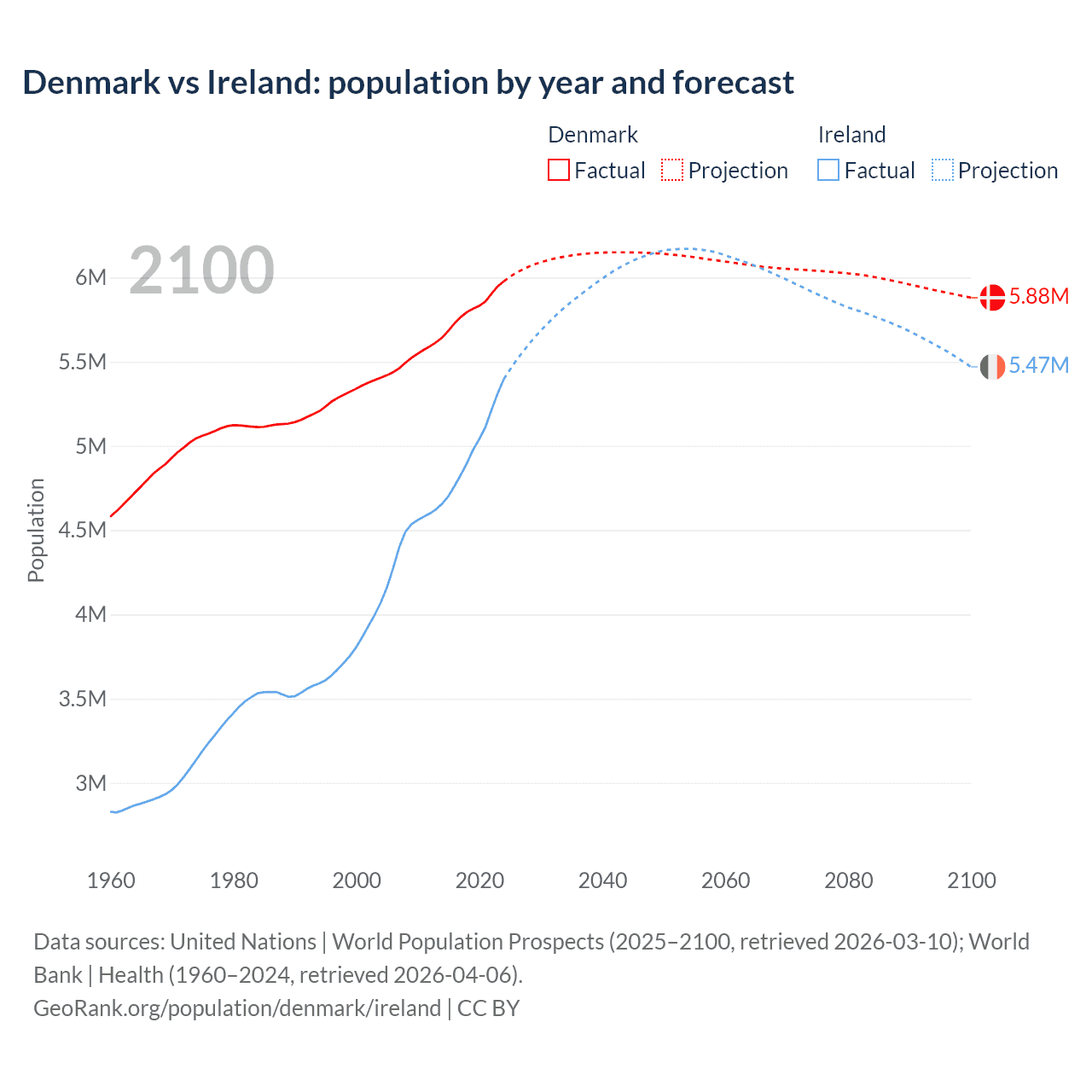 The latest officially reported population of Denmark was 5,976,992 in 2024 vs 5,395,790 people in Ireland in 2024. In 2026, based on the adjusted UN estimation, the current Denmark's population is 6,032,403 people compared to 5,518,360 in Ireland.