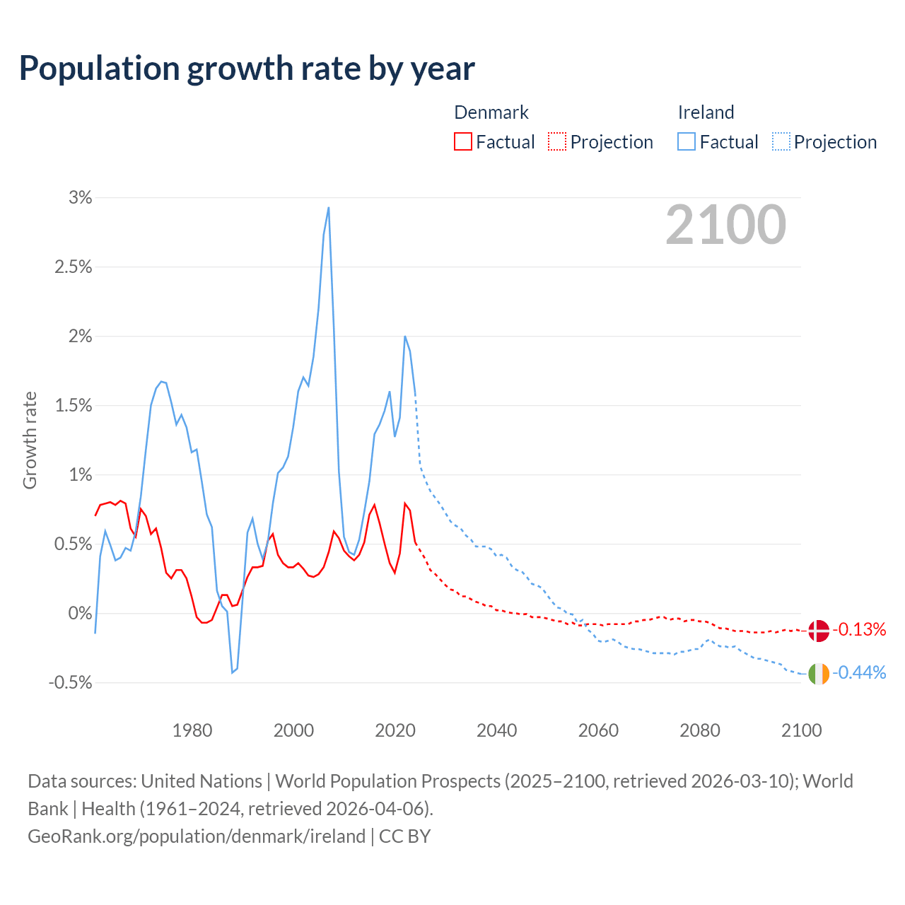 - For the last 10 years, Denmark has had an average growth rate of +0.57% per year vs +1.41% in Ireland.