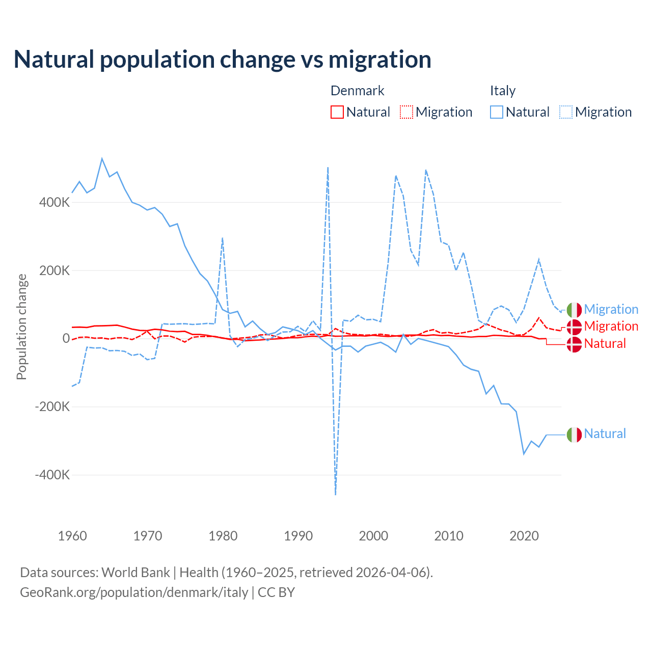 Over the last 10 years, 15.4% of the population change in Denmark is from natural causes (a gain of 51,826 people) and 84.6% is from migration (a gain of 284,848 people). In Italy 68.6% is from natural causes (a loss of 2,239,084 people) and 31.4% is from migration (a gain of 1,026,128 people).