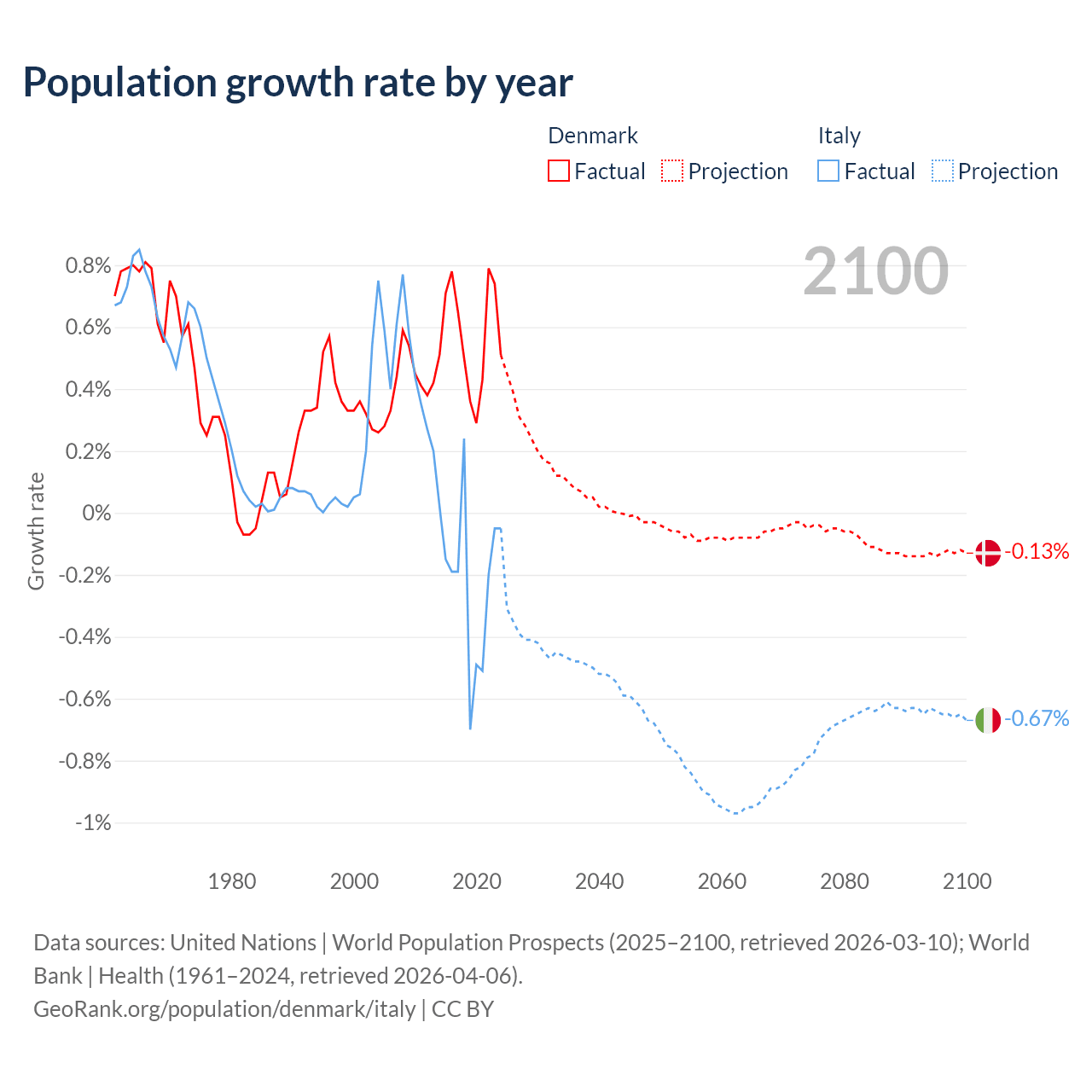 - For the last 10 years, Denmark has had an average growth rate of +0.57% per year vs -0.21% in Italy.