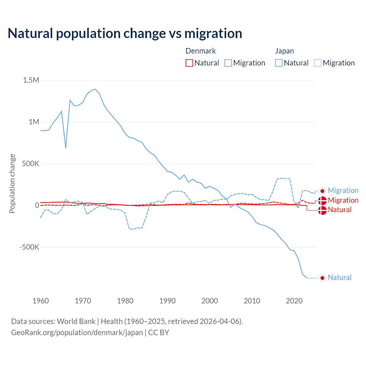 Over the last 10 years, 15.4% of the population change in Denmark is from natural causes (a gain of 51,826 people) and 84.6% is from migration (a gain of 284,848 people). In Japan 73.6% is from natural causes (a loss of 5,178,838 people) and 26.4% is from migration (a gain of 1,860,103 people).