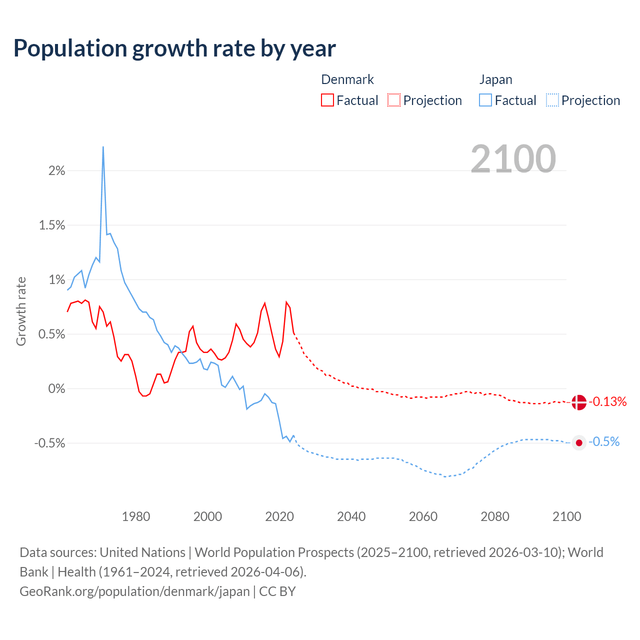 - For the last 10 years, Denmark has had an average growth rate of +0.57% per year vs -0.25% in Japan.