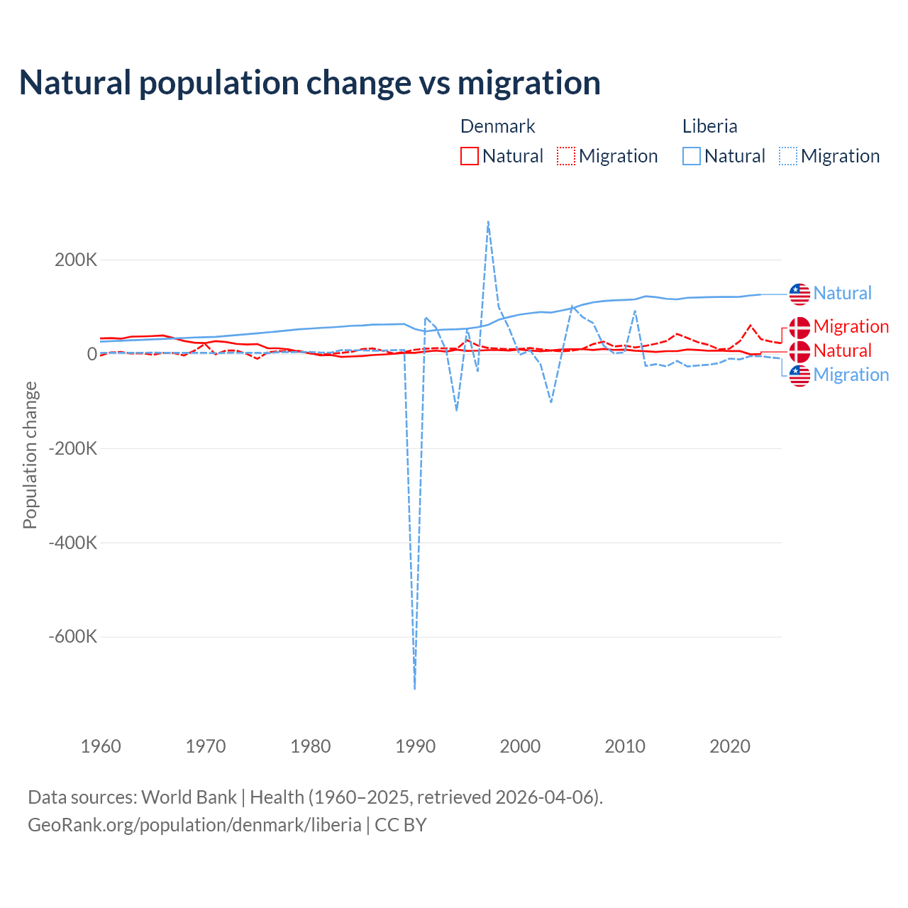 Over the last 10 years, 15.4% of the population change in Denmark is from natural causes (a gain of 51,826 people) and 84.6% is from migration (a gain of 284,848 people). In Liberia 87.7% is from natural causes (a gain of 1,202,387 people) and 12.3% is from migration (a loss of 168,316 people).