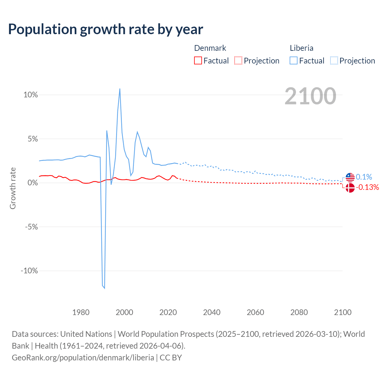 - For the last 10 years, Denmark has had an average growth rate of +0.57% per year vs +2.09% in Liberia.