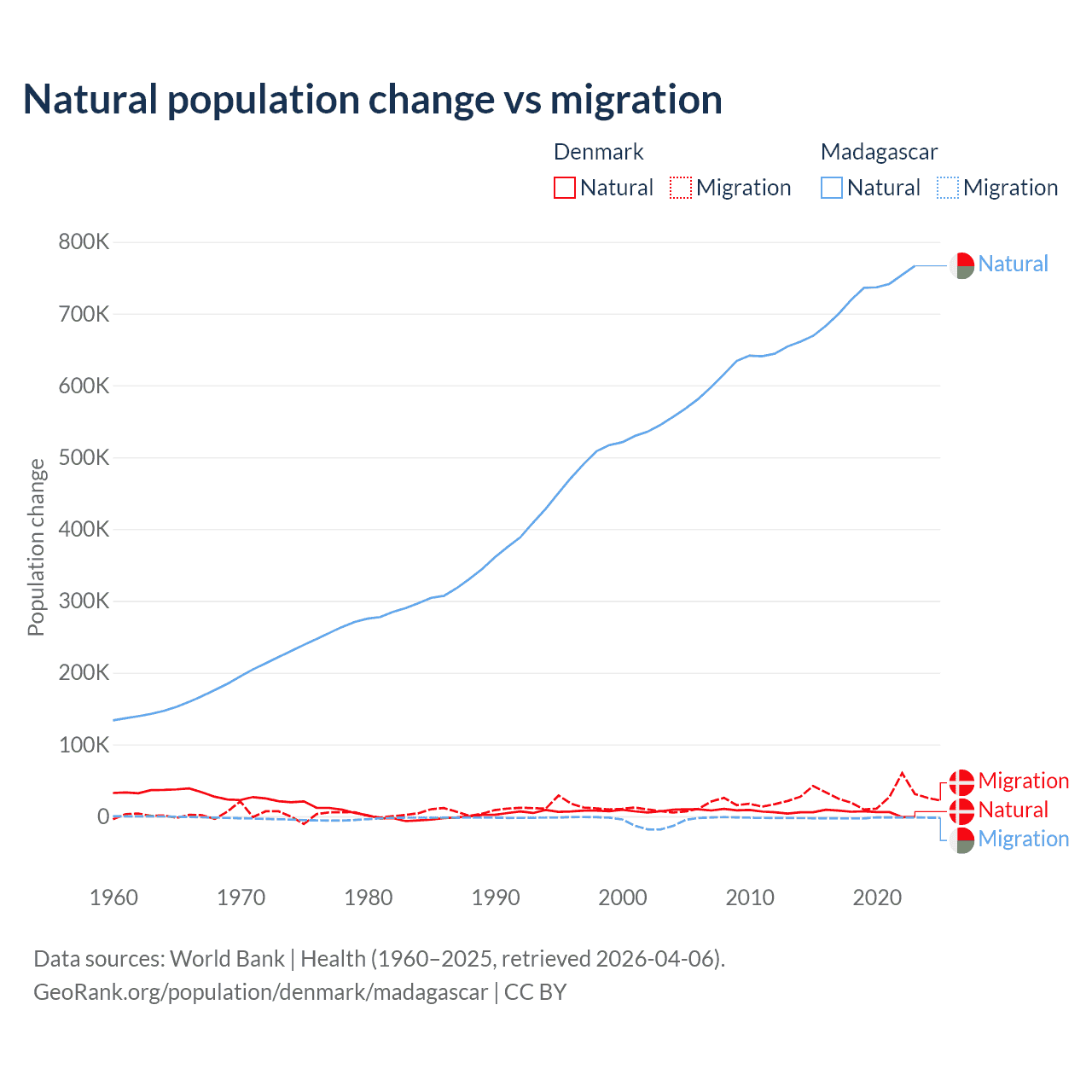 Over the last 10 years, 15.4% of the population change in Denmark is from natural causes (a gain of 51,826 people) and 84.6% is from migration (a gain of 284,848 people). In Madagascar 99.7% is from natural causes (a gain of 7,165,578 people) and 0.31% is from migration (a loss of 22,384 people).
