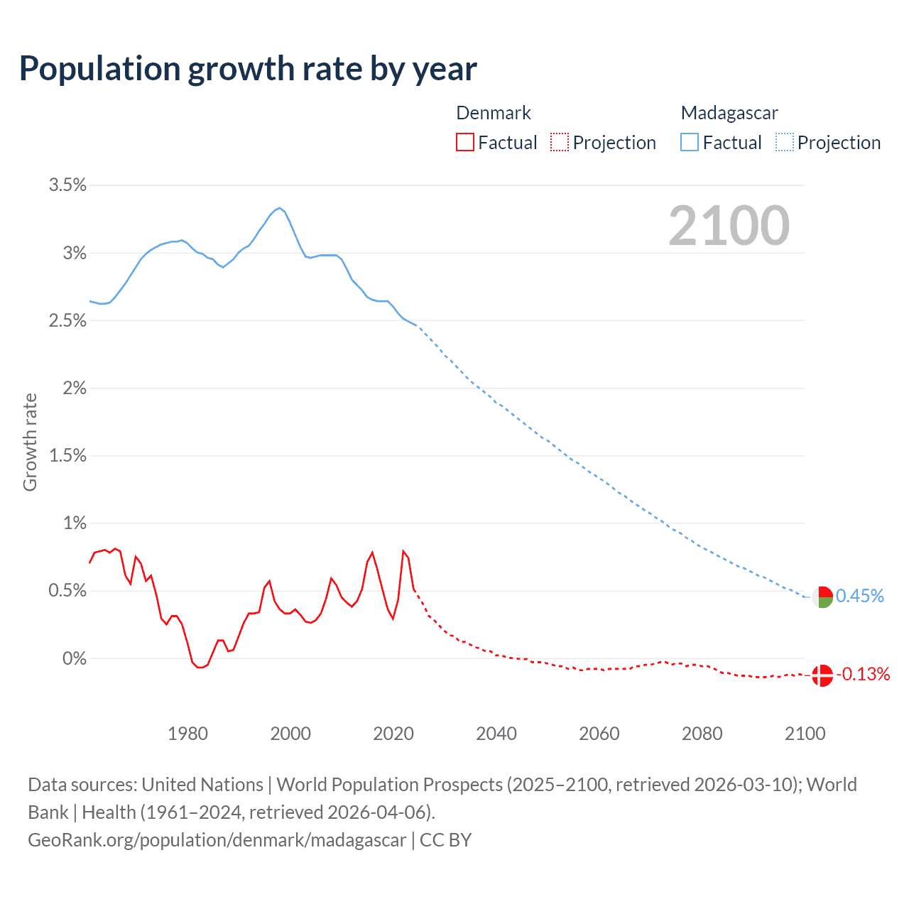 - For the last 10 years, Denmark has had an average growth rate of +0.57% per year vs +2.6% in Madagascar.