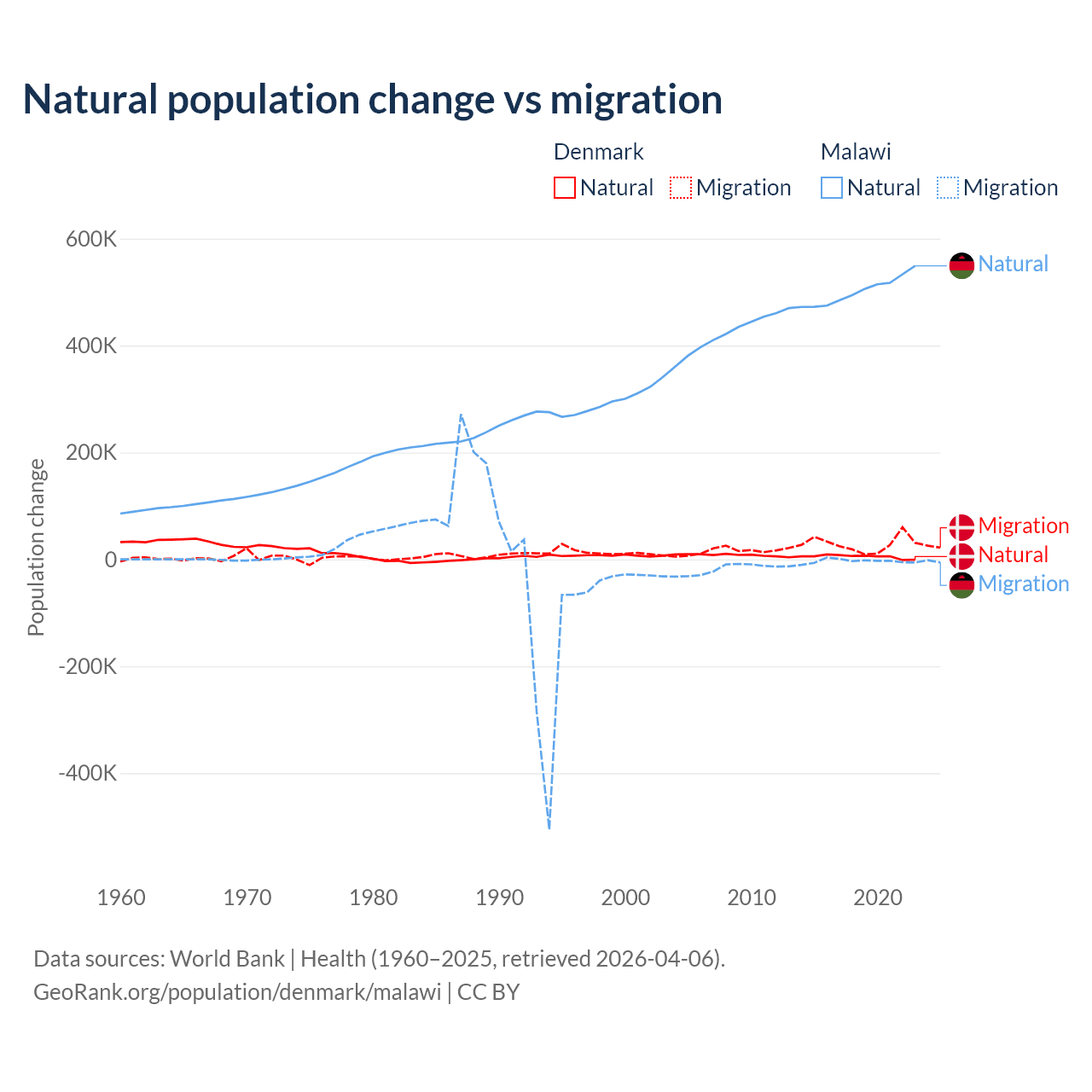 Over the last 10 years, 15.4% of the population change in Denmark is from natural causes (a gain of 51,826 people) and 84.6% is from migration (a gain of 284,848 people). In Malawi 99.3% is from natural causes (a gain of 5,019,393 people) and 0.67% is from migration (a loss of 33,768 people).