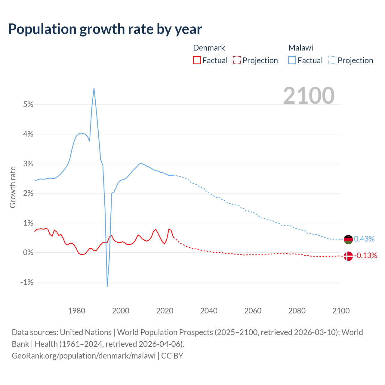 - For the last 10 years, Denmark has had an average growth rate of +0.57% per year vs +2.7% in Malawi.