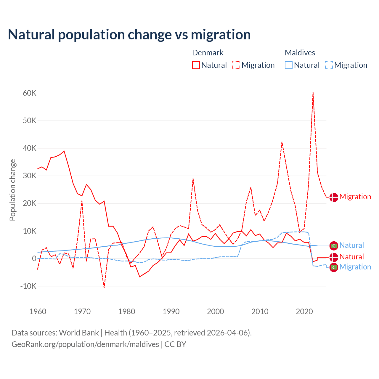 Over the last 10 years, 15.4% of the population change in Denmark is from natural causes (a gain of 51,826 people) and 84.6% is from migration (a gain of 284,848 people). In Maldives 42.7% is from natural causes (a gain of 51,342 people) and 57.3% is from migration (a gain of 68,788 people).