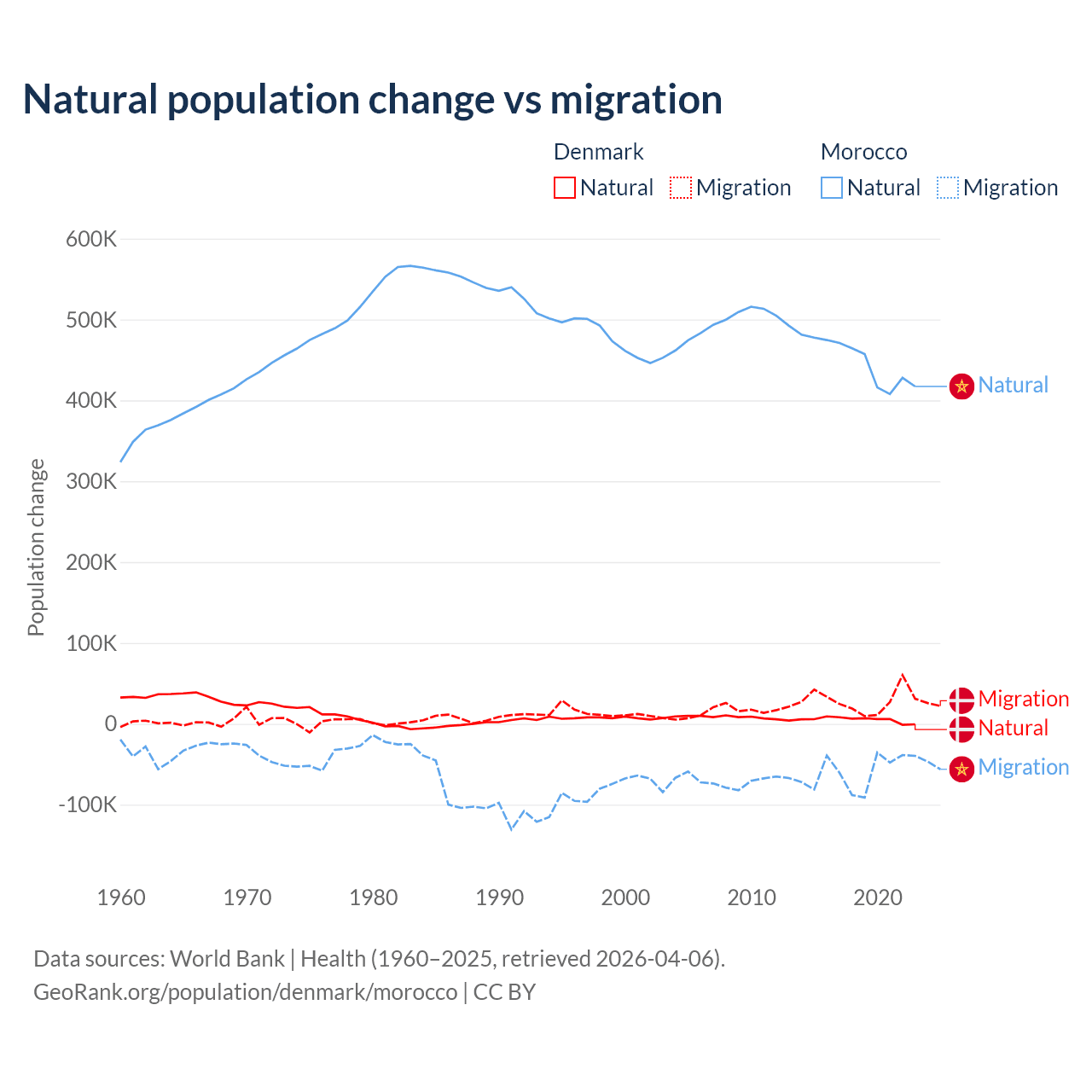 Over the last 10 years, 15.4% of the population change in Denmark is from natural causes (a gain of 51,826 people) and 84.6% is from migration (a gain of 284,848 people). In Morocco 88.3% is from natural causes (a gain of 4,495,223 people) and 11.7% is from migration (a loss of 594,083 people).