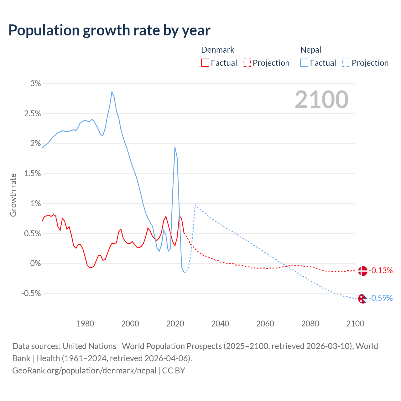 - For the last 10 years, Denmark has had an average growth rate of +0.57% per year vs +0.66% in Nepal.