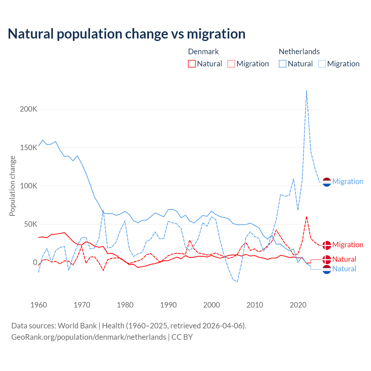 Over the last 10 years, 15.4% of the population change in Denmark is from natural causes (a gain of 51,826 people) and 84.6% is from migration (a gain of 284,848 people). In the Netherlands 11.8% is from natural causes (a gain of 134,554 people) and 88.2% is from migration (a gain of 1,006,495 people).