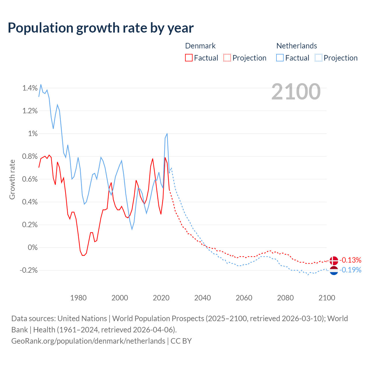 - For the last 10 years, Denmark has had an average growth rate of +0.57% per year vs +0.62% in the Netherlands.