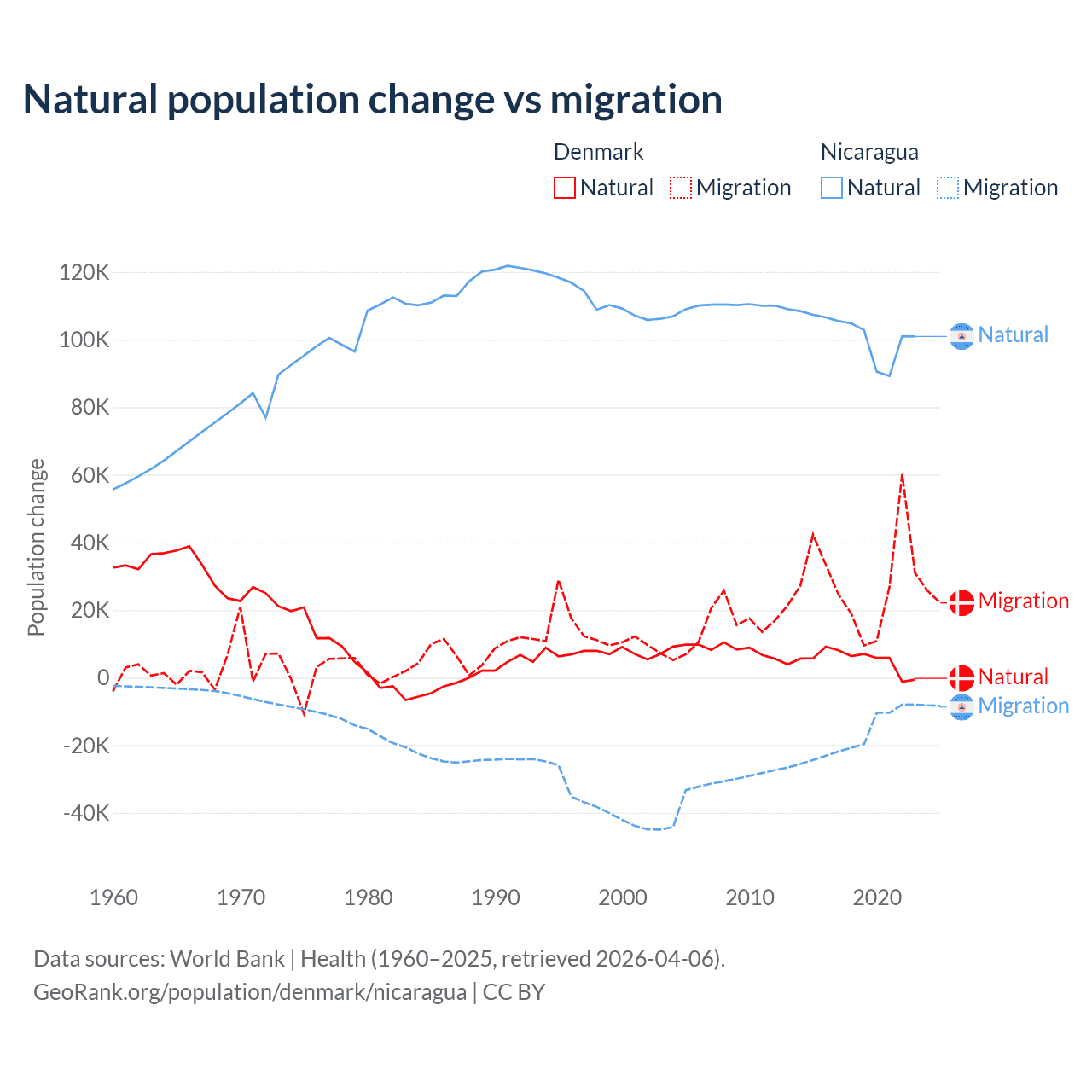 Over the last 10 years, 15.4% of the population change in Denmark is from natural causes (a gain of 51,826 people) and 84.6% is from migration (a gain of 284,848 people). In Nicaragua 85.5% is from natural causes (a gain of 1,017,084 people) and 14.5% is from migration (a loss of 172,078 people).