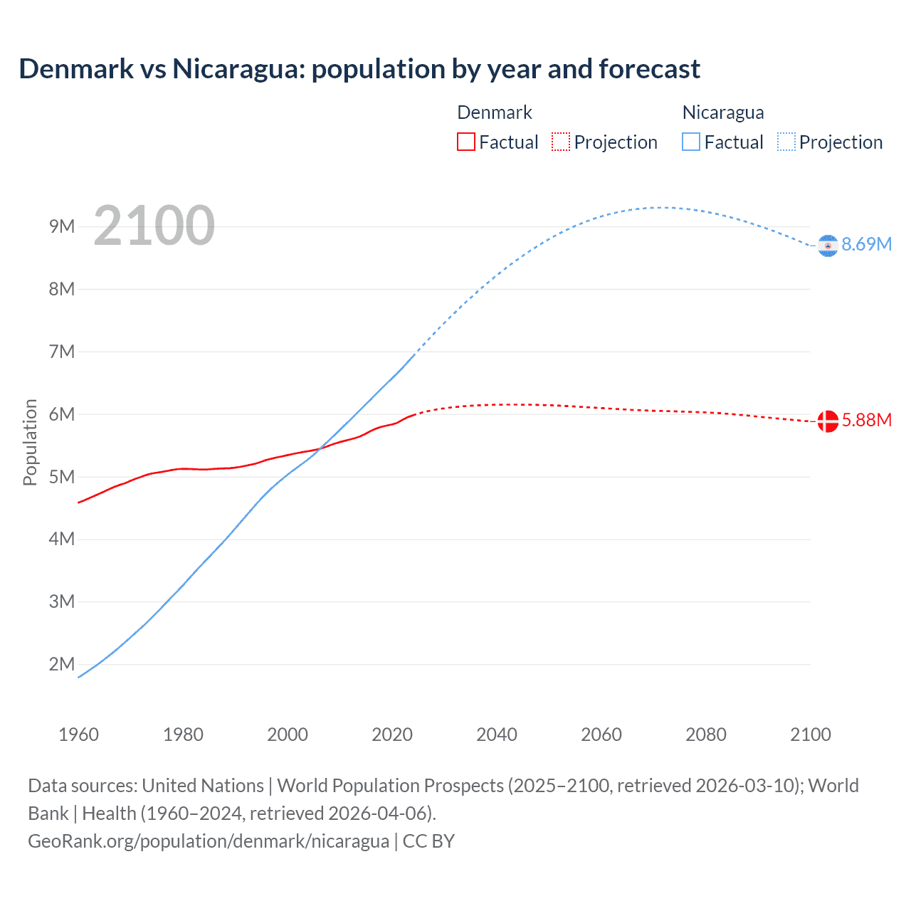 The latest officially reported population of Denmark was 5,976,992 in 2024 vs 6,916,140 people in Nicaragua in 2024. In 2026, based on the adjusted UN estimation, the current Denmark's population is 6,032,403 people compared to 7,124,343 in Nicaragua.