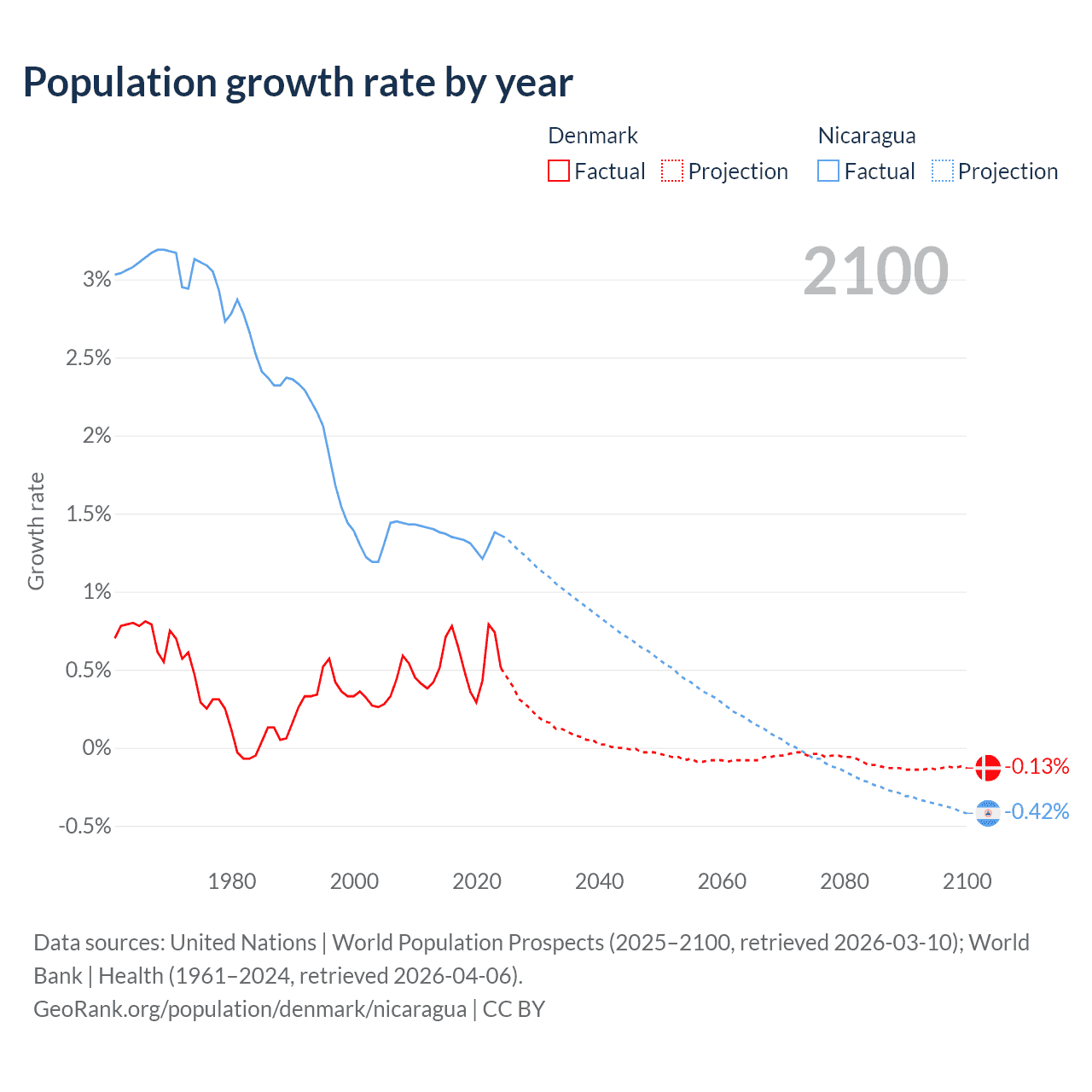 - For the last 10 years, Denmark has had an average growth rate of +0.57% per year vs +1.33% in Nicaragua.