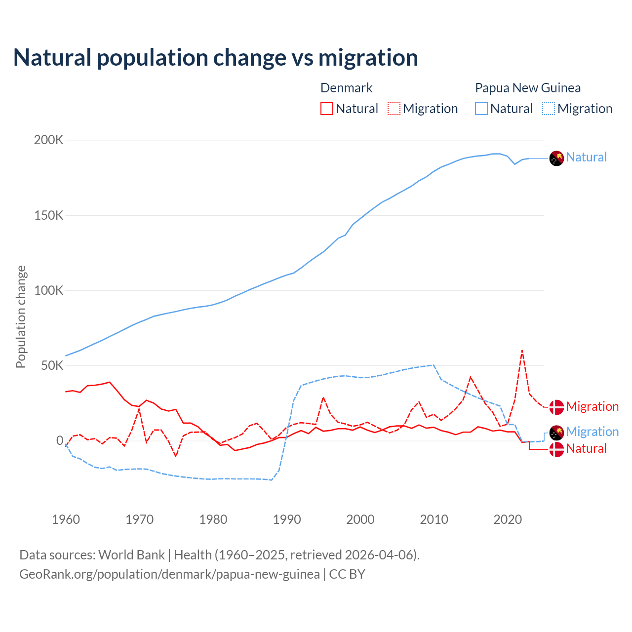 Over the last 10 years, 15.4% of the population change in Denmark is from natural causes (a gain of 51,826 people) and 84.6% is from migration (a gain of 284,848 people). In Papua New Guinea 91% is from natural causes (a gain of 1,883,906 people) and 8.98% is from migration (a gain of 185,900 people).
