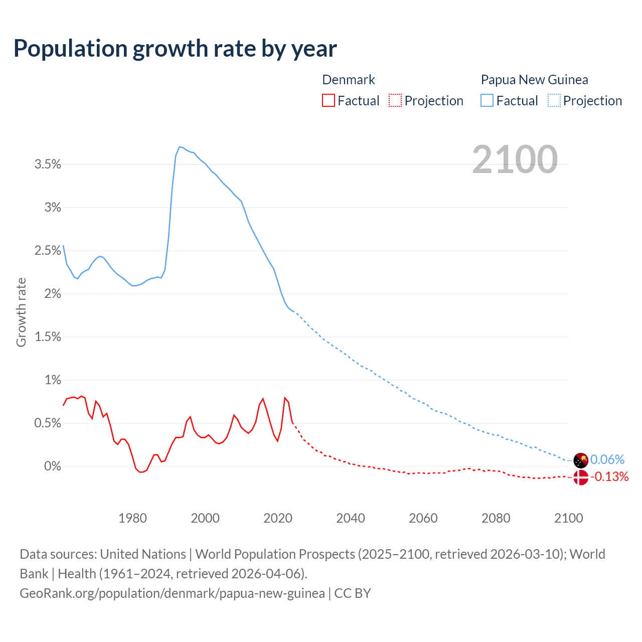 - For the last 10 years, Denmark has had an average growth rate of +0.57% per year vs +2.23% in Papua New Guinea.