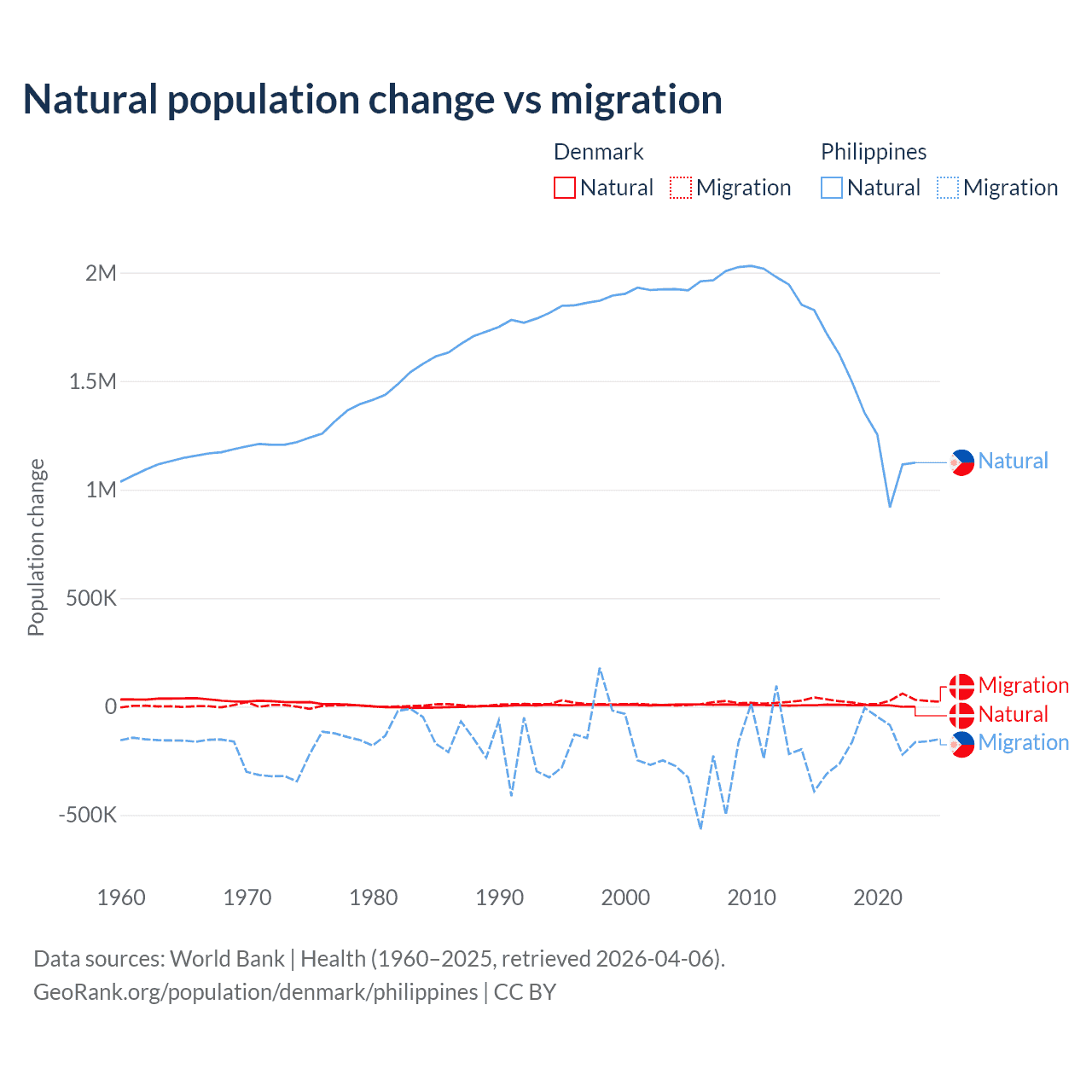 Over the last 10 years, 15.4% of the population change in Denmark is from natural causes (a gain of 51,826 people) and 84.6% is from migration (a gain of 284,848 people). In the Philippines 88.5% is from natural causes (a gain of 14,279,705 people) and 11.5% is from migration (a loss of 1,848,117 people).