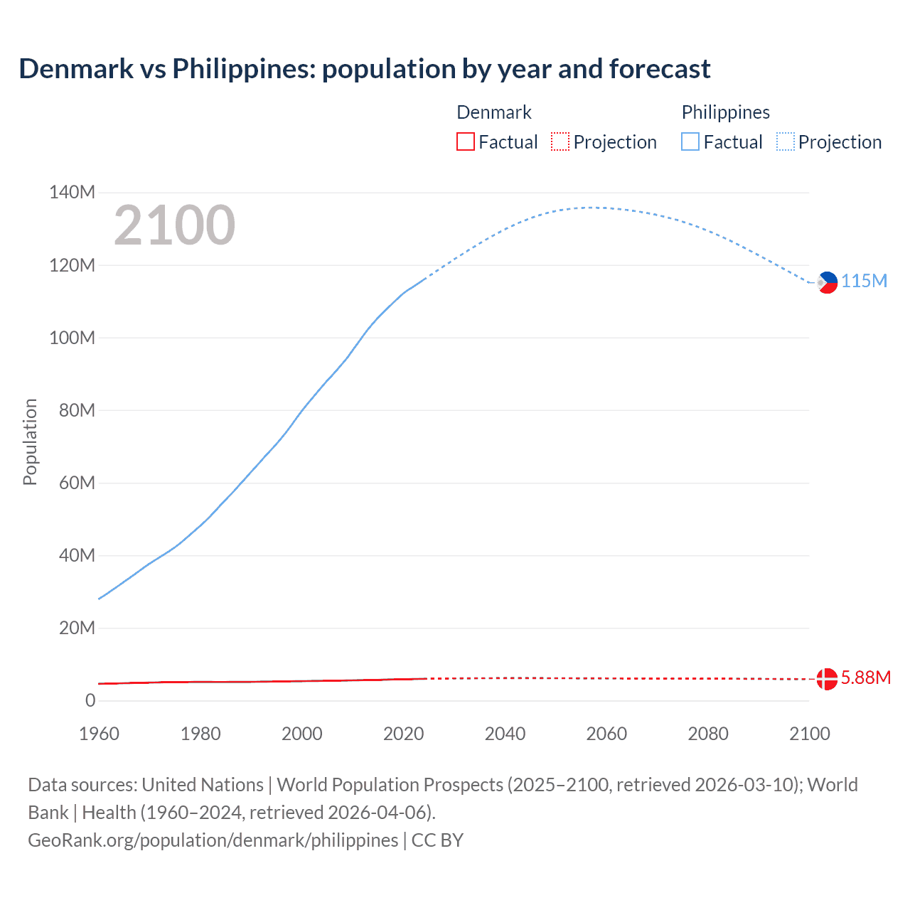 The latest officially reported population of Denmark was 5,976,992 in 2024 vs 115,843,670 people in the Philippines in 2024. In 2026, based on the adjusted UN estimation, the current Denmark's population is 6,032,403 people compared to 117,991,570 in the Philippines.