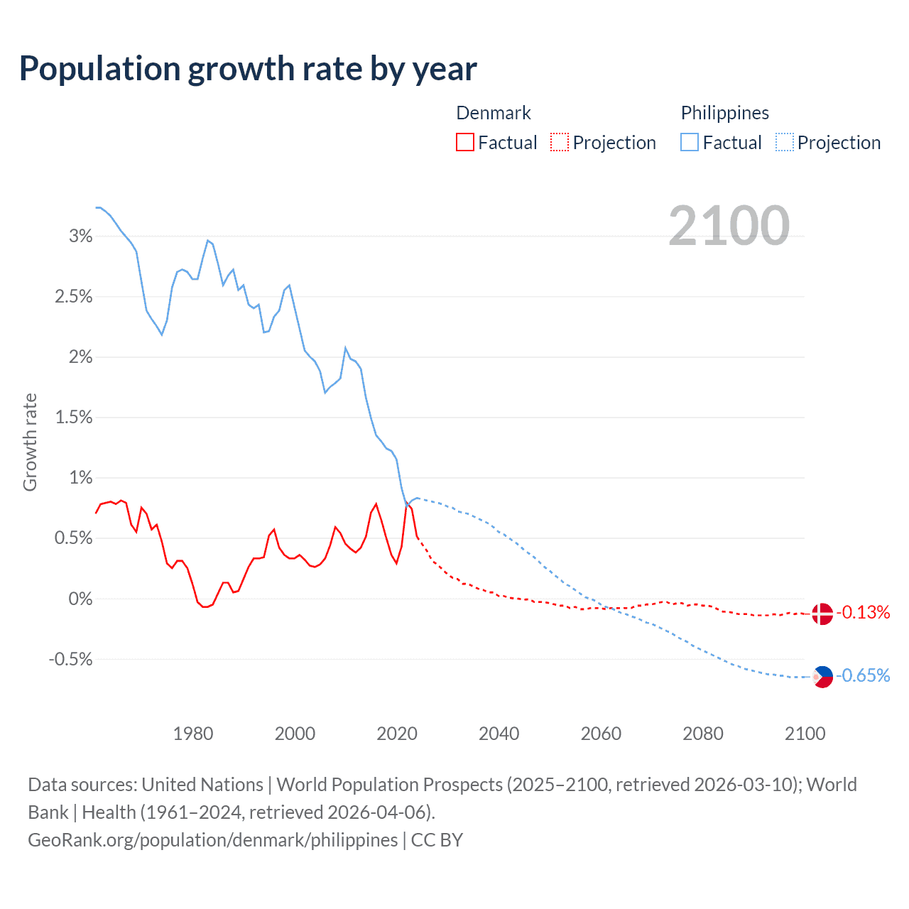 - For the last 10 years, Denmark has had an average growth rate of +0.57% per year vs +1.16% in the Philippines.