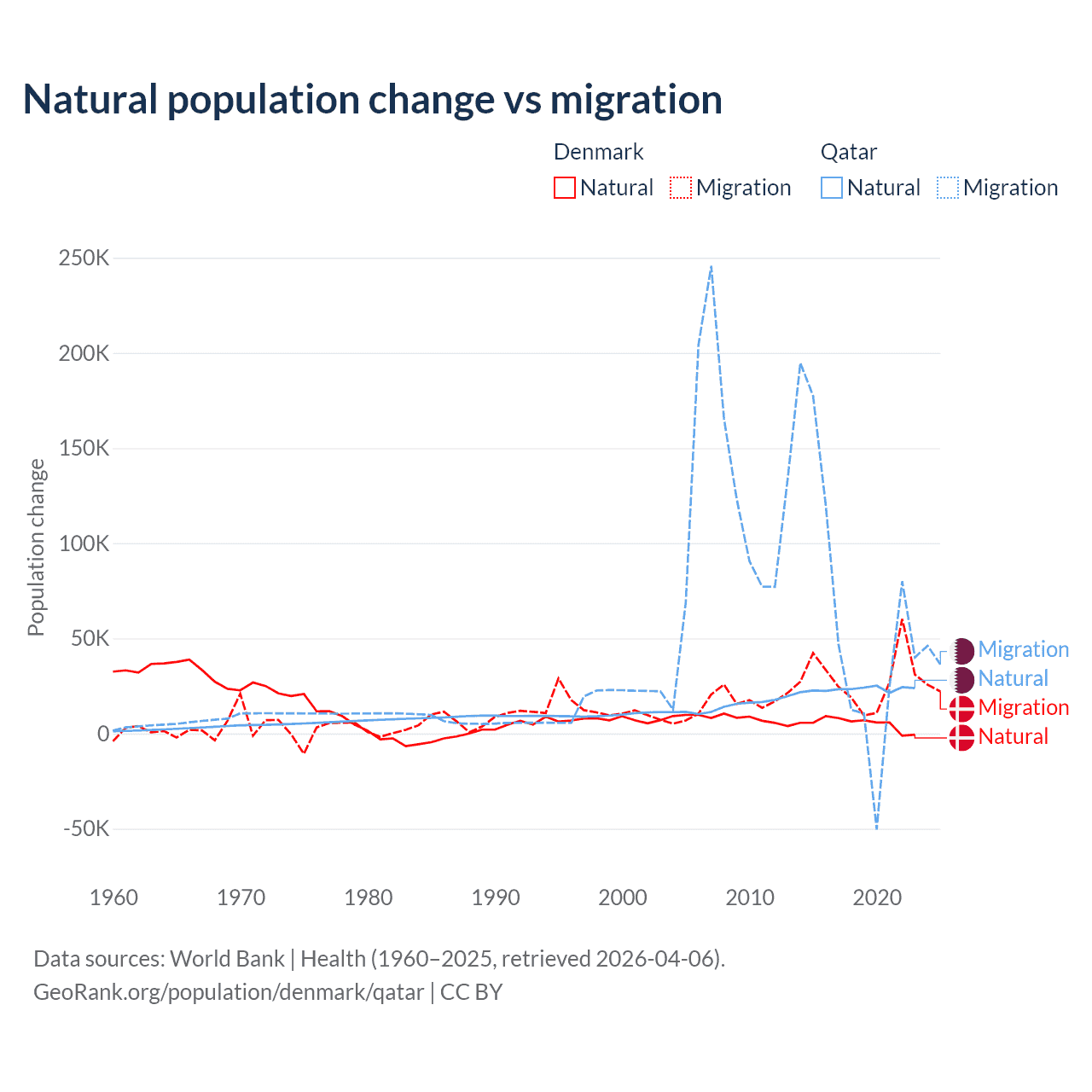 Over the last 10 years, 15.4% of the population change in Denmark is from natural causes (a gain of 51,826 people) and 84.6% is from migration (a gain of 284,848 people). In Qatar 26.1% is from natural causes (a gain of 232,009 people) and 73.9% is from migration (a gain of 655,712 people).