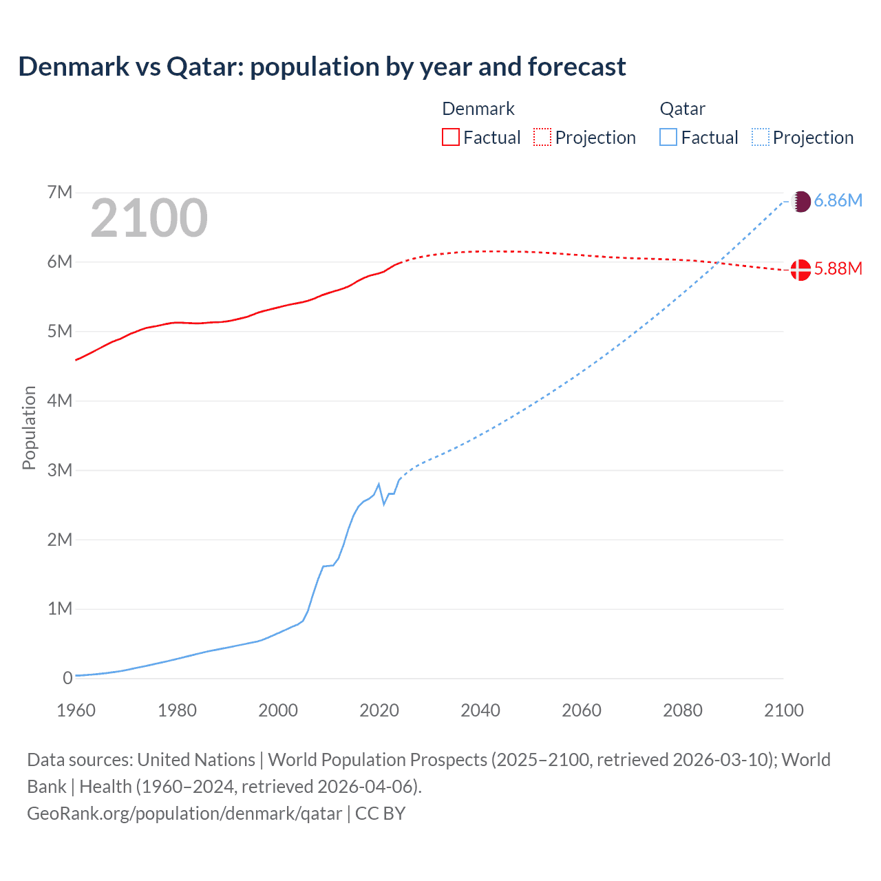 Denmark vs Qatar: population by year and forecast