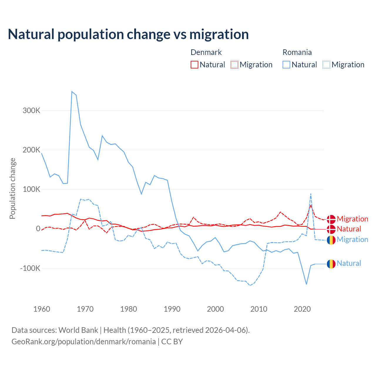 Over the last 10 years, 15.4% of the population change in Denmark is from natural causes (a gain of 51,826 people) and 84.6% is from migration (a gain of 284,848 people). In Romania 82% is from natural causes (a loss of 766,295 people) and 18% is from migration (a loss of 167,917 people).