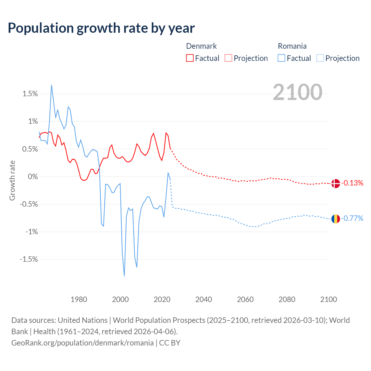 - For the last 10 years, Denmark has had an average growth rate of +0.57% per year vs -0.43% in Romania.