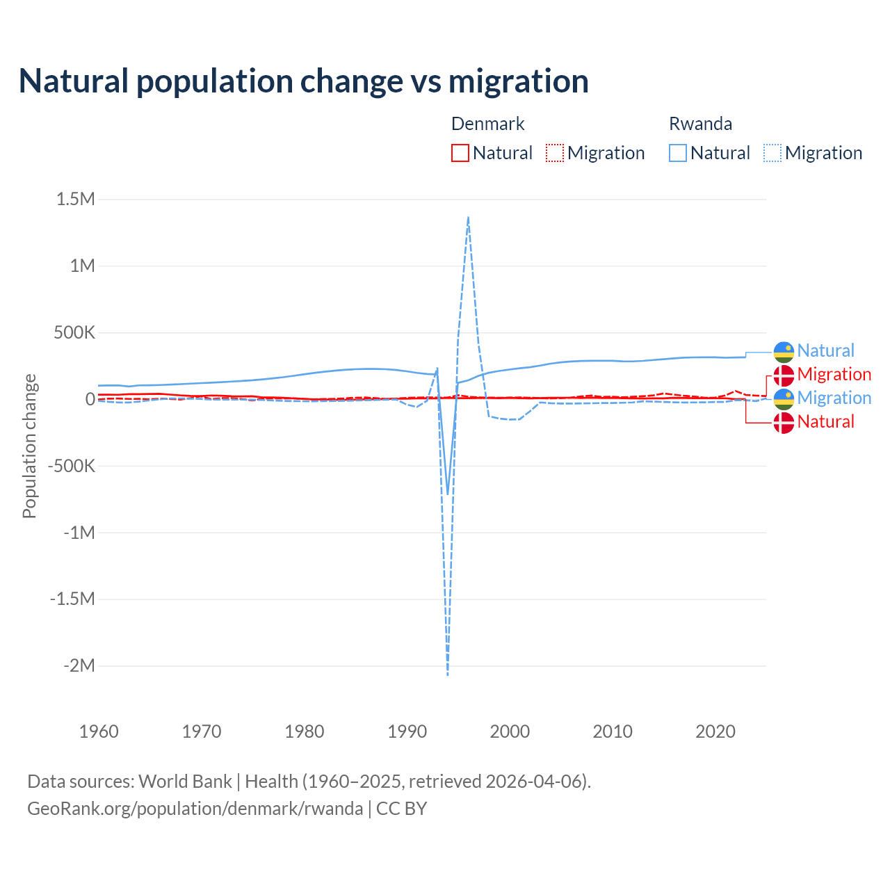 Over the last 10 years, 15.4% of the population change in Denmark is from natural causes (a gain of 51,826 people) and 84.6% is from migration (a gain of 284,848 people). In Rwanda 93.8% is from natural causes (a gain of 3,081,296 people) and 6.18% is from migration (a loss of 203,035 people).