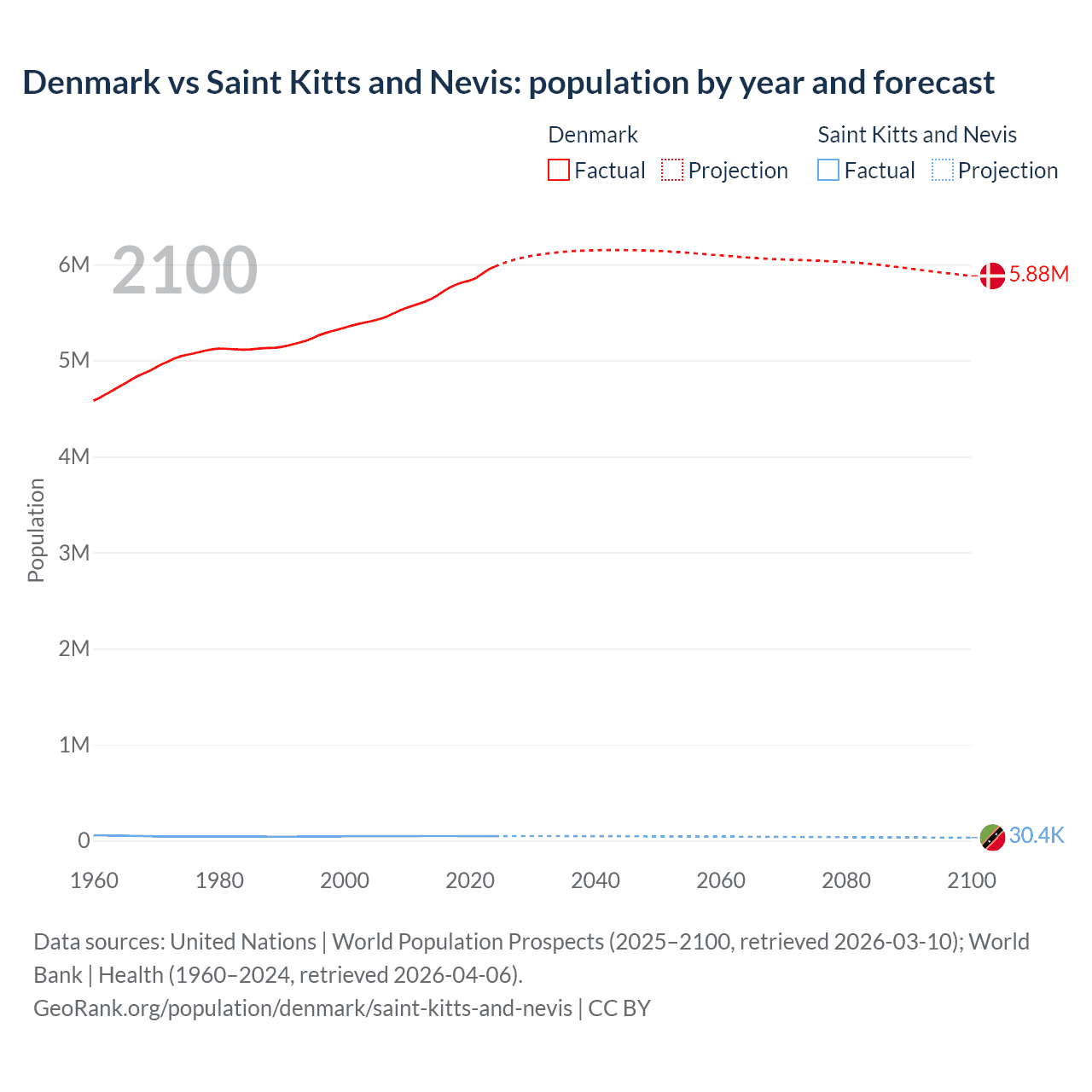 Denmark vs Saint Kitts and Nevis: population by year and forecast