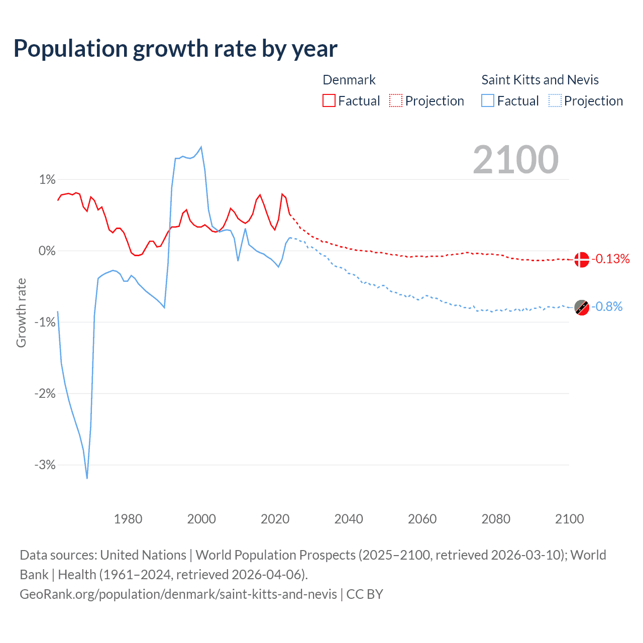 - For the last 10 years, Denmark has had an average growth rate of +0.57% per year vs -0.04% in Saint Kitts and Nevis.