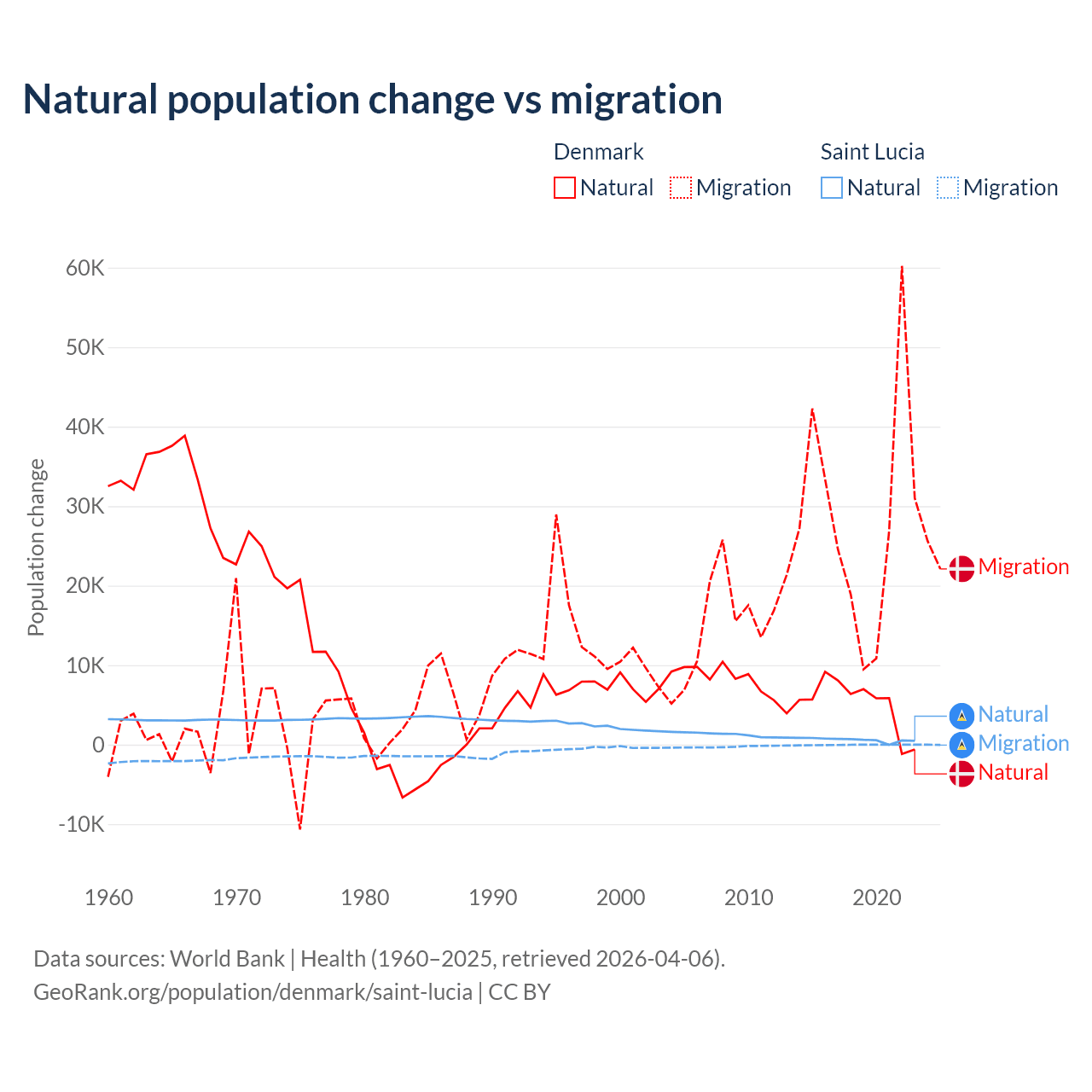 Over the last 10 years, 15.4% of the population change in Denmark is from natural causes (a gain of 51,826 people) and 84.6% is from migration (a gain of 284,848 people). In Saint Lucia 95.7% is from natural causes (a gain of 6,039 people) and 4.31% is from migration (a loss of 272 people).