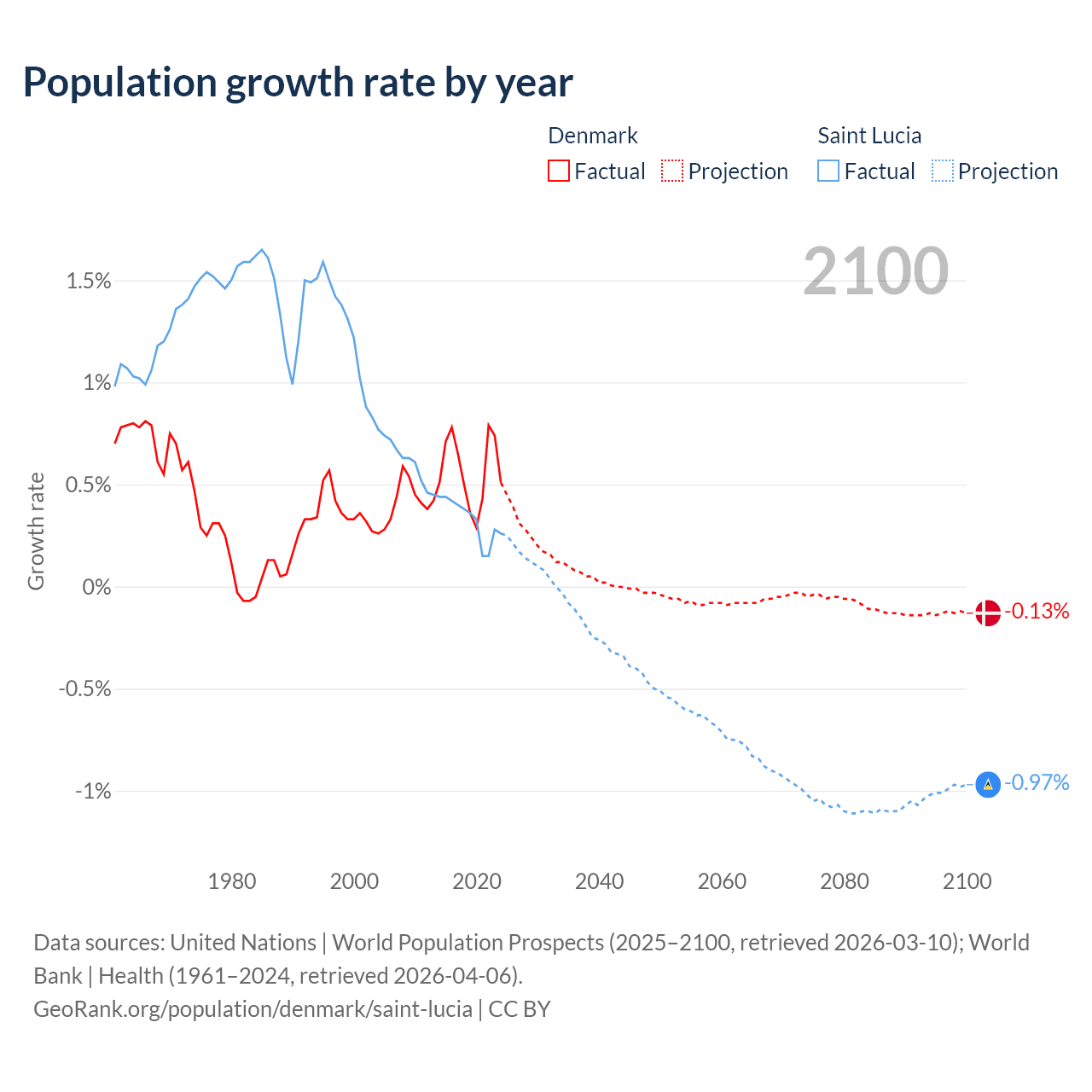 - For the last 10 years, Denmark has had an average growth rate of +0.57% per year vs +0.33% in Saint Lucia.